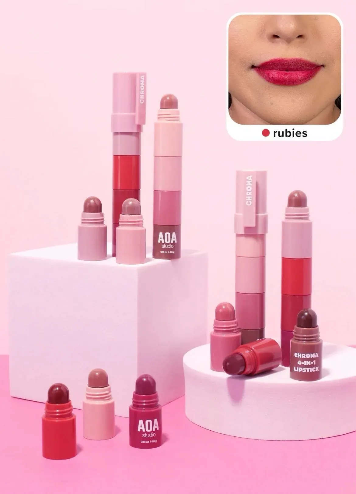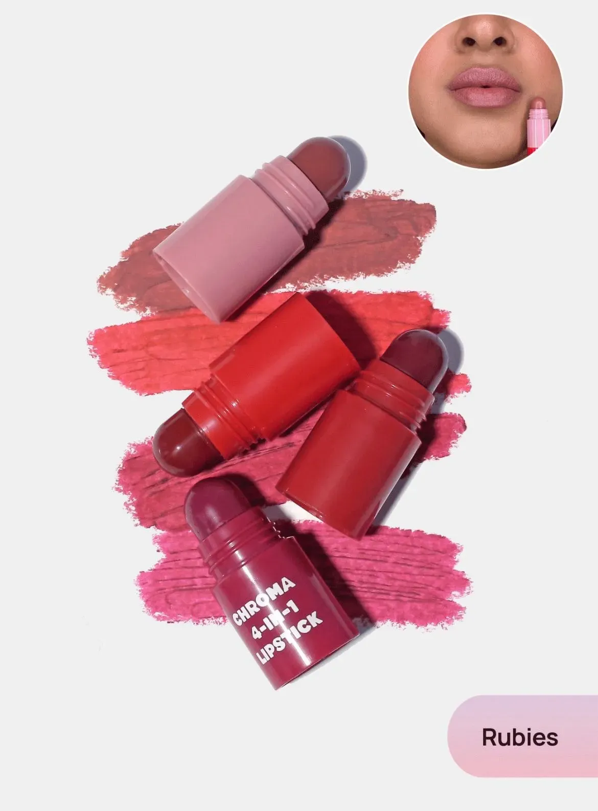 ¡Haz un combo con nuestro lápiz labial 4 en 1 Chroma! Obtén CUATRO tonos complementarios en UN producto de bolsillo para horas de color labial mate y acogedor.