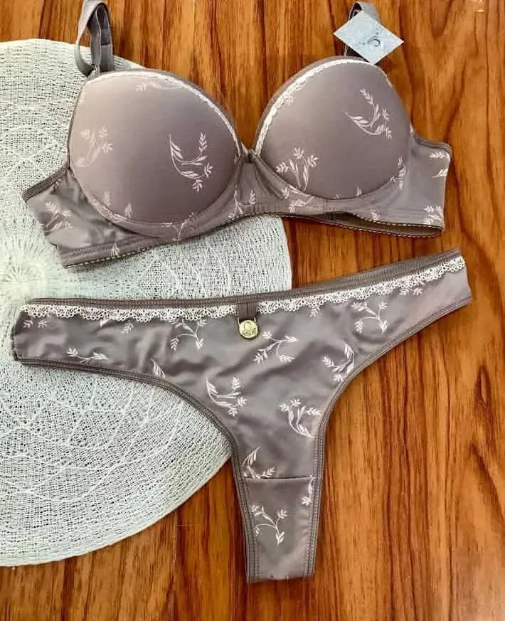 Conjunto taza soft de microfibra estampada con puntilla fina, dije dorado y cola less.