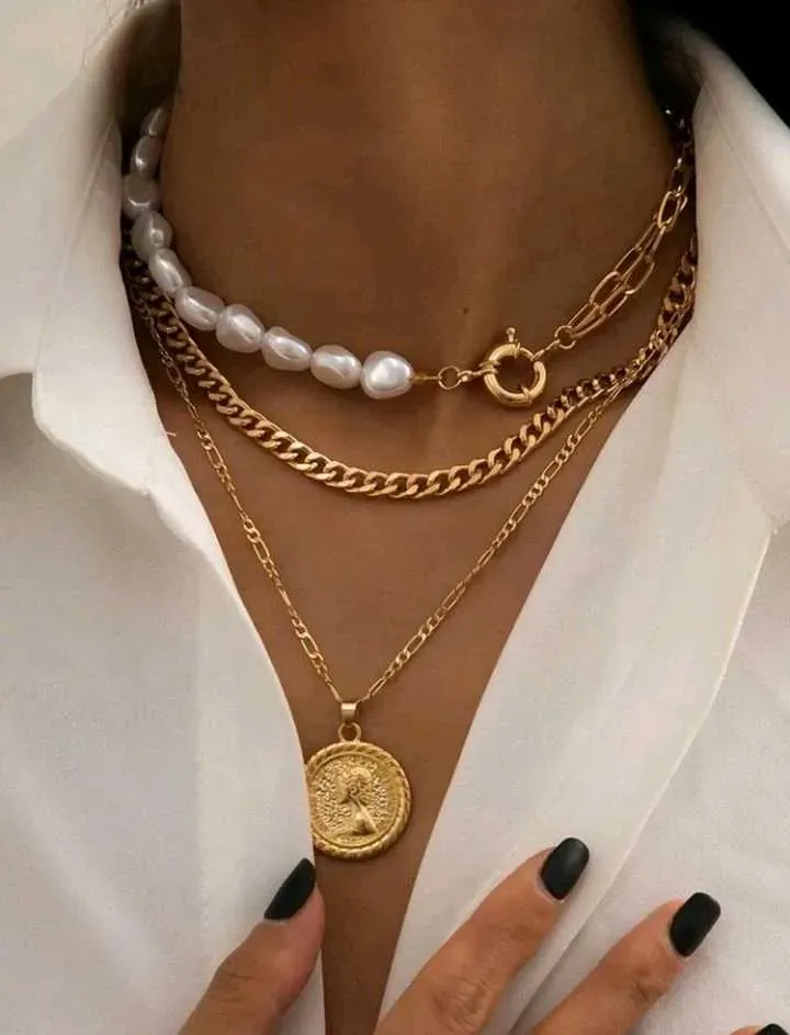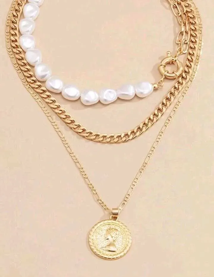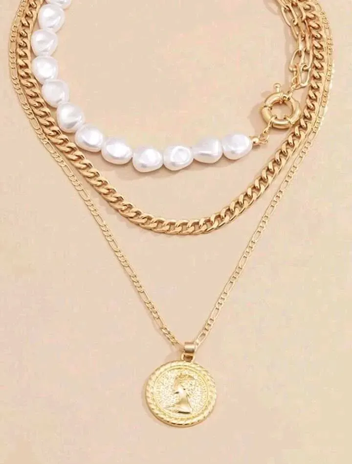 Juego de 3 piezas Collar con colgante de cabeza humana multinivel, collar con capas simple y de moda con perlas.