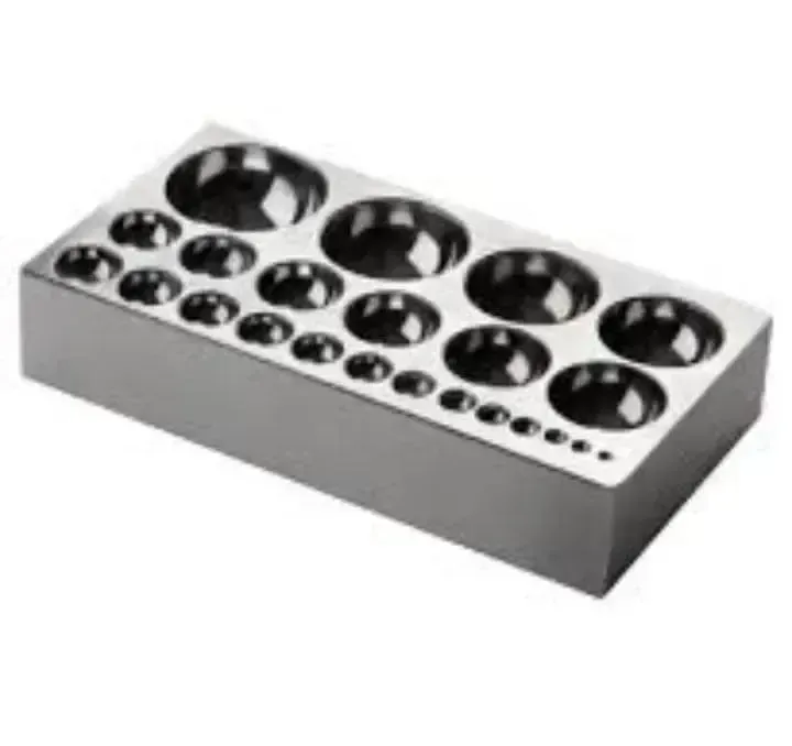 Plancha de hierro con 27 huecos, ultilizada para embutir metales los otros lados son lisos y pueden usarse para aplanar metal. Las concavidades van desde 2.4 cm hasta 2 mm. Mide 13.5 x 6