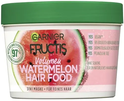 La mascarilla capilar Garnier Fructis Hair Food de Sandía sirve para revitalizar, nutrir e hidratar el cabello, especialmente formulada para cabello fino o apagado que busca volumen y vitalidad.