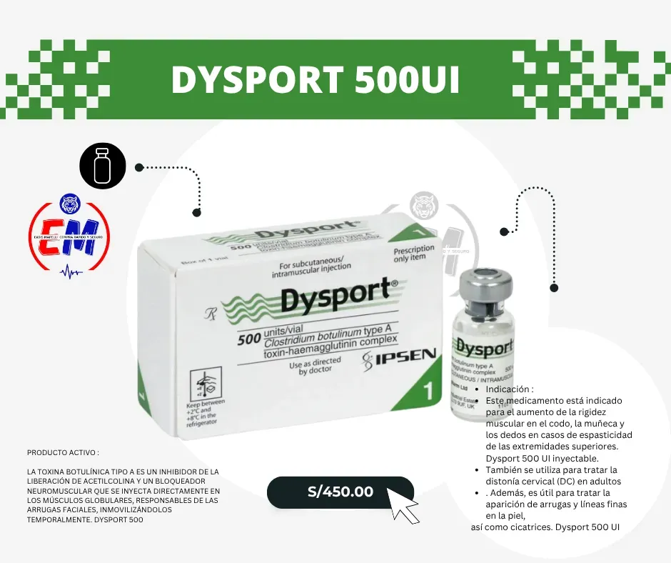 Dysport 500U, fabricado por el laboratorio Ipsen, es una toxina botulínica tipo A de uso médico y estético, especialmente formulada para tratar arrugas dinámicas, líneas de expresión y trastornos neuromuscular...