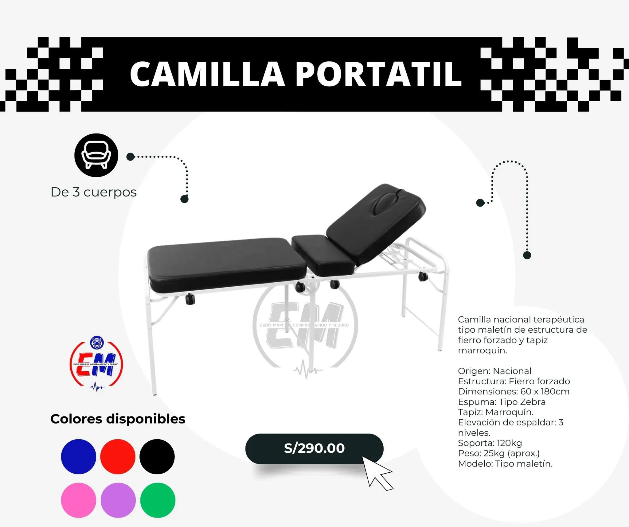 Camilla nacional terapéutica tipo maletín de estructura de fierro forzado y tapiz marroquín.