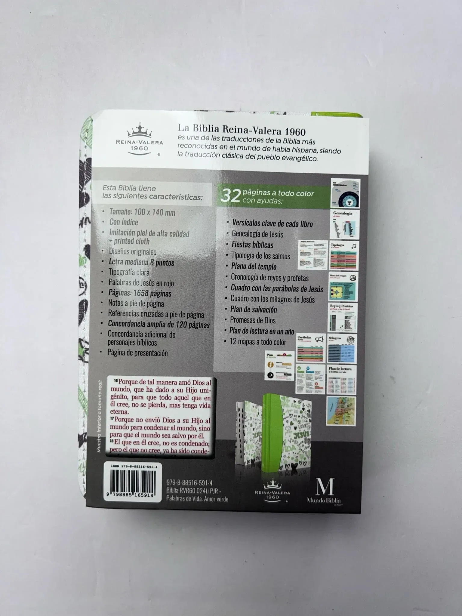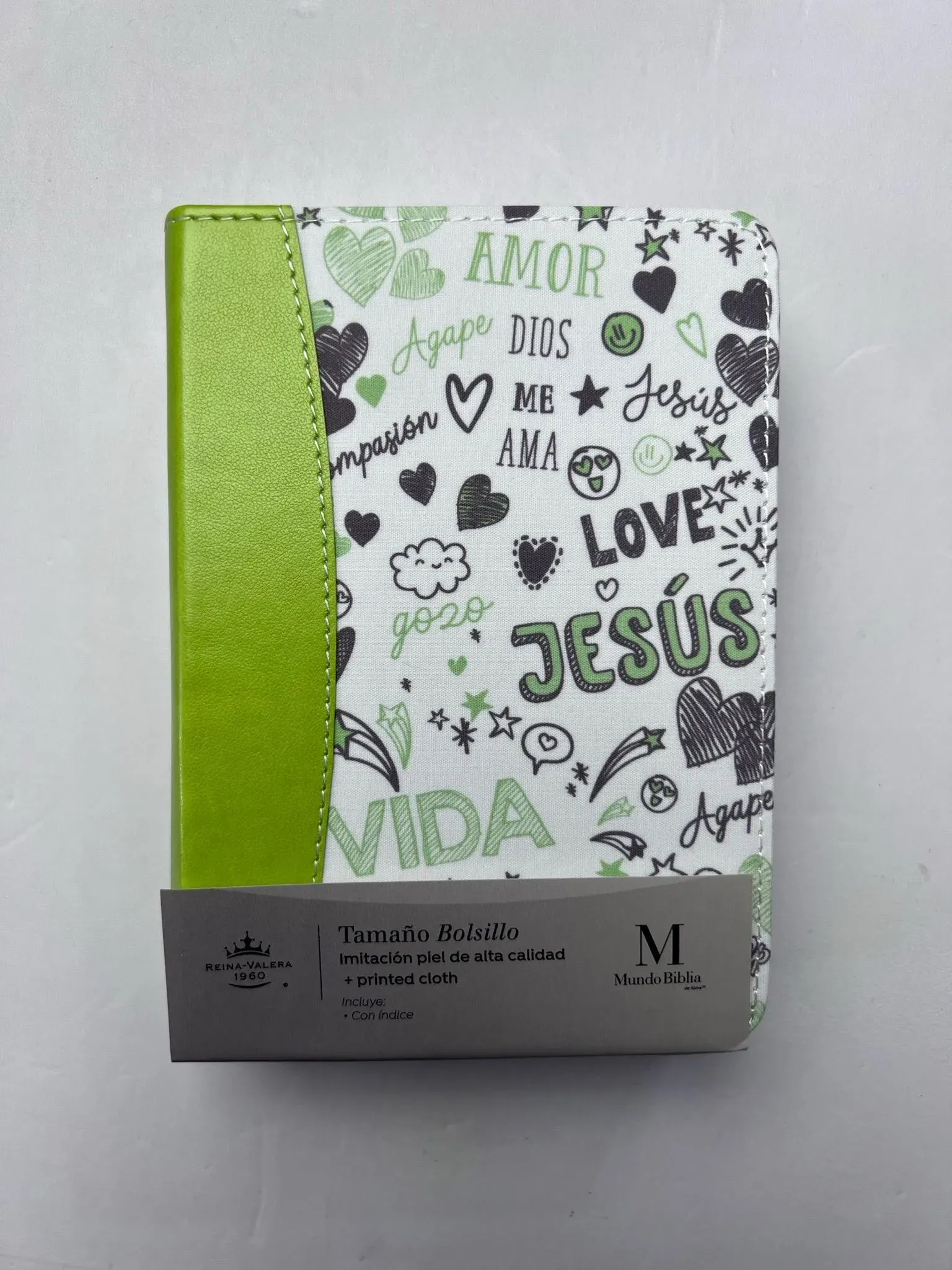 Biblia de Bolsillo RV1960 imit y tela impresa con índice - palabras de vida amor verde - Reina Valera 1960 - 9798885165914