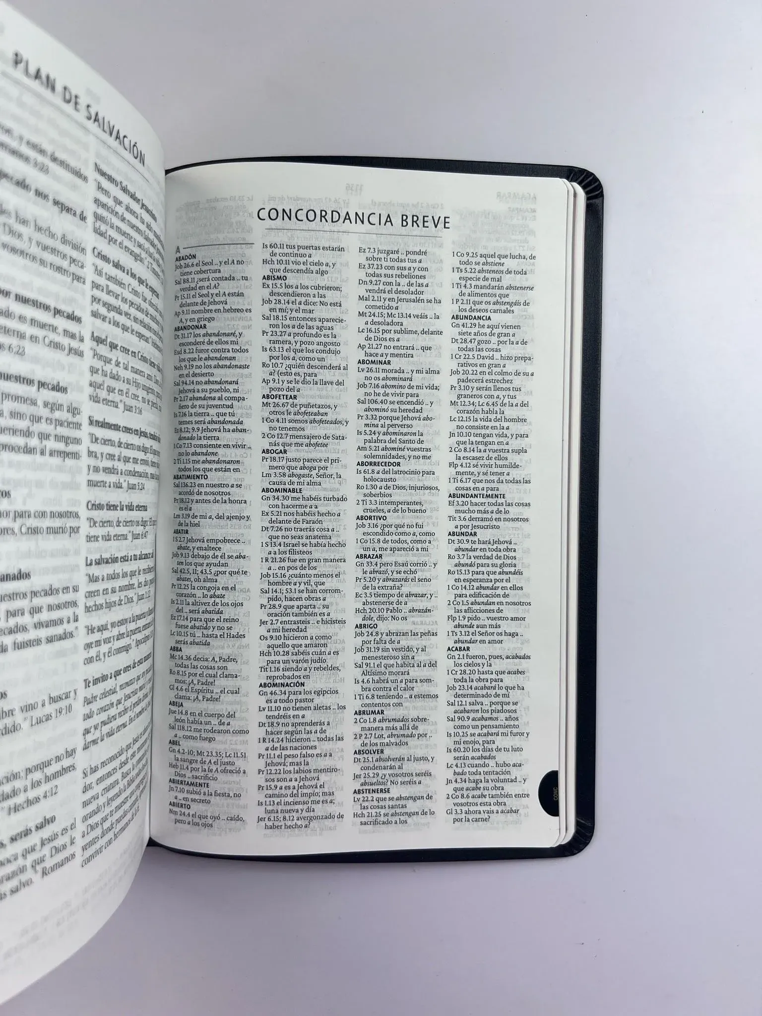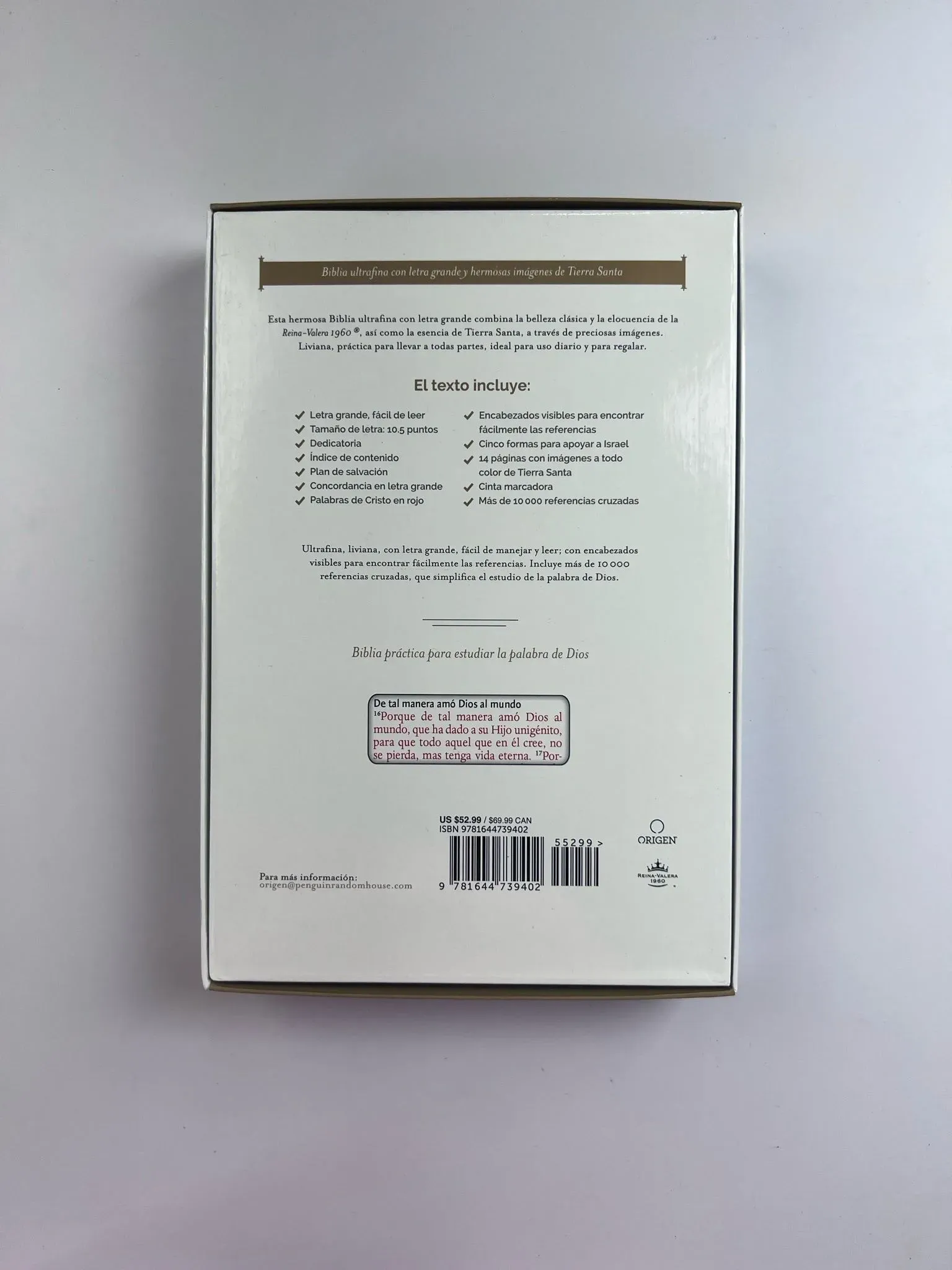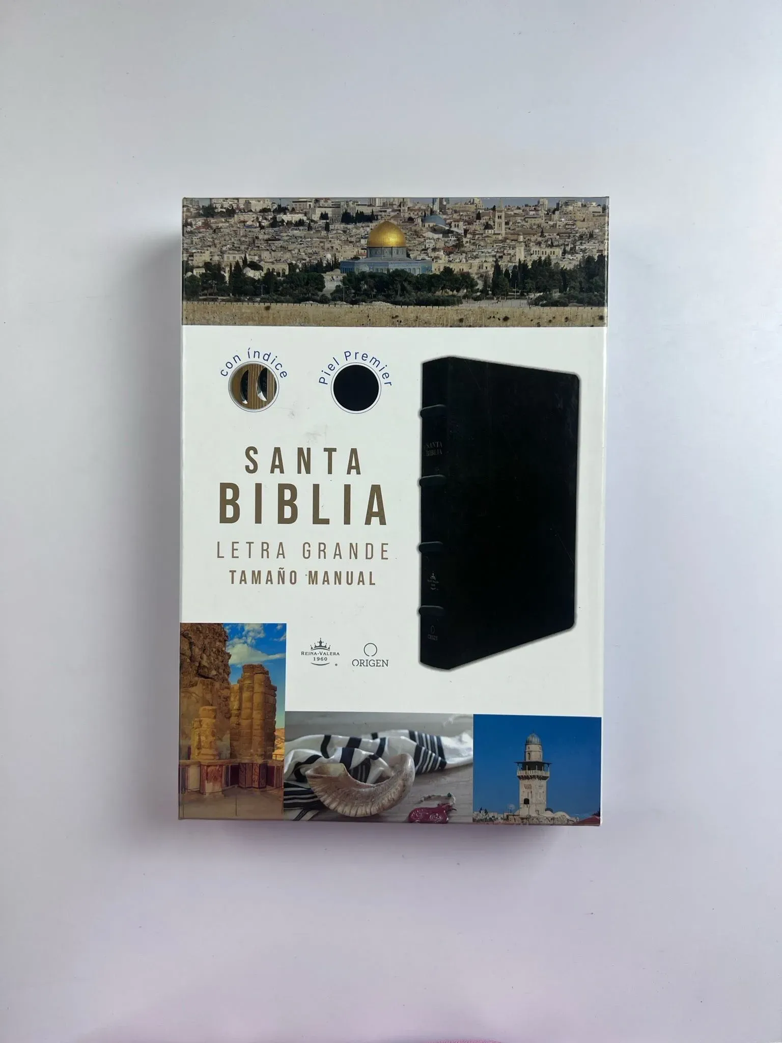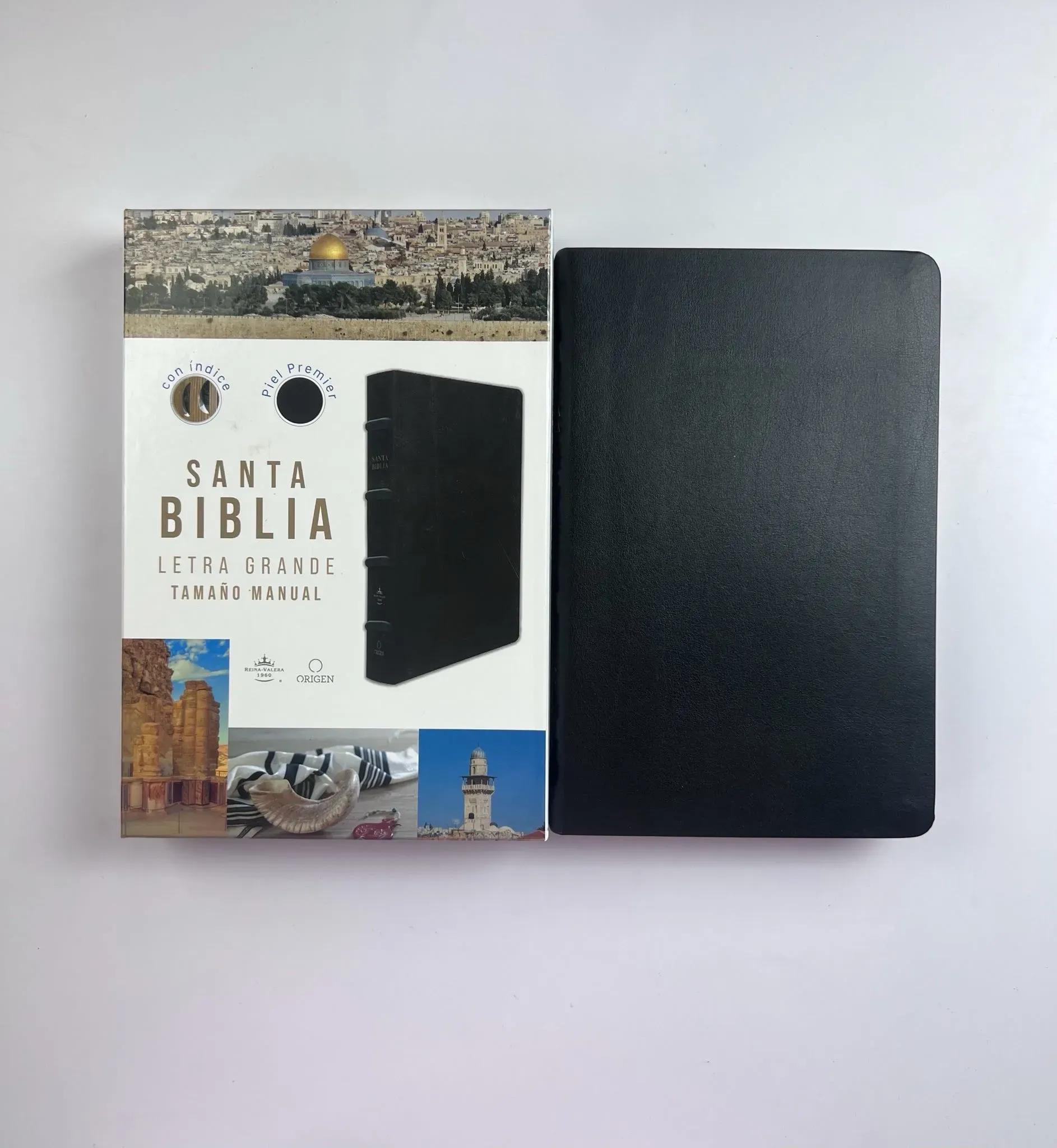 Biblia tamaño manual, ultrafina y con letra grande. Piel Premier negra con índice en una caja de presentación, con cinta marcadora y fotos a color de Tierra Santa.