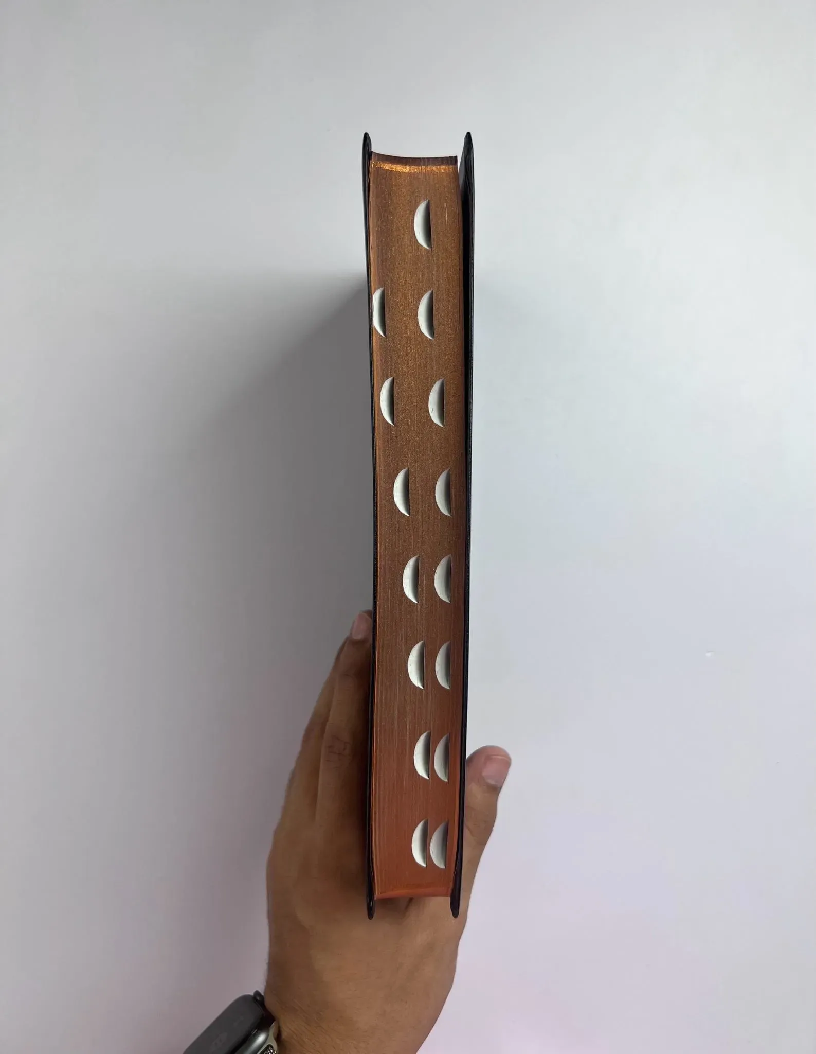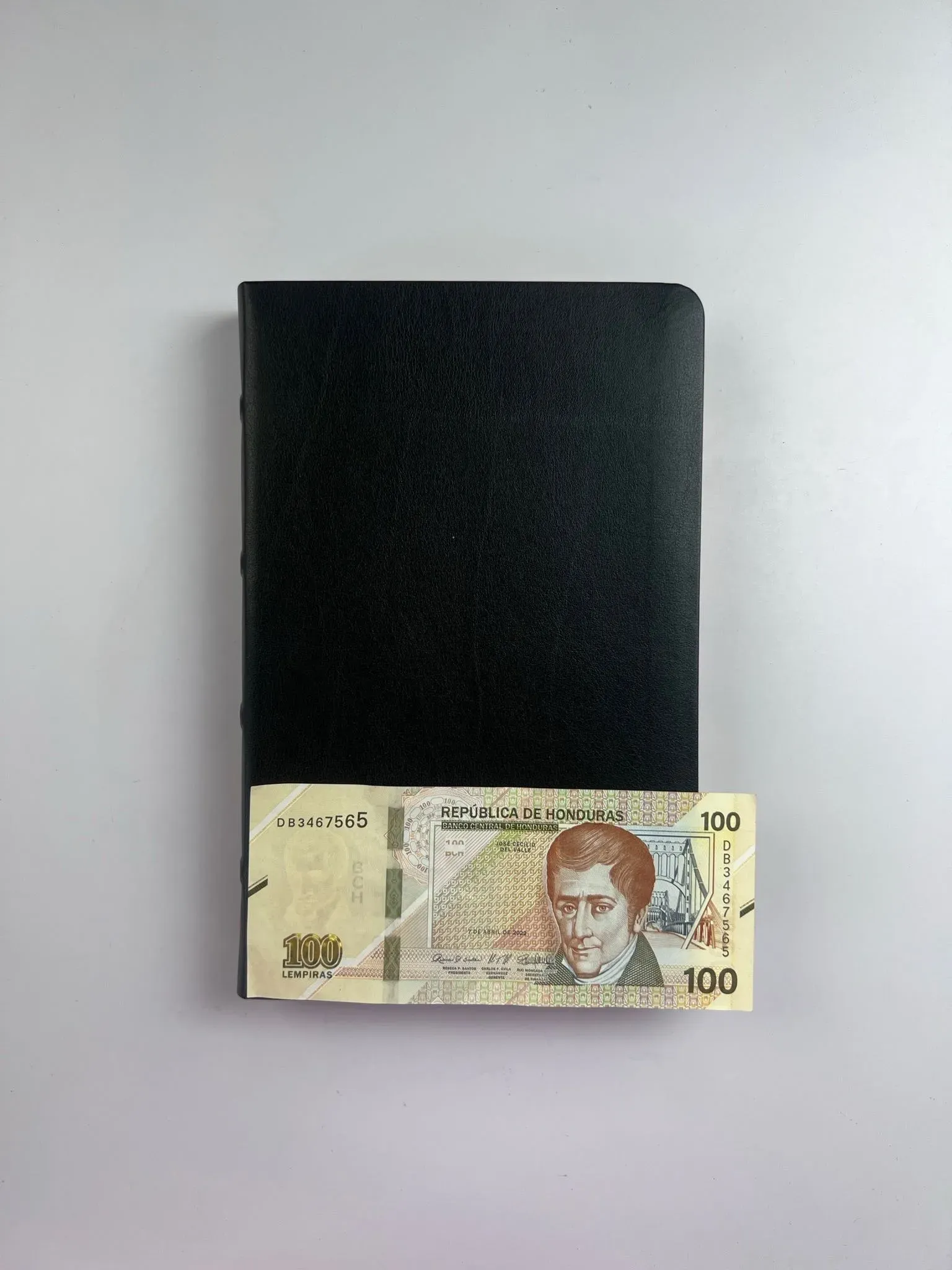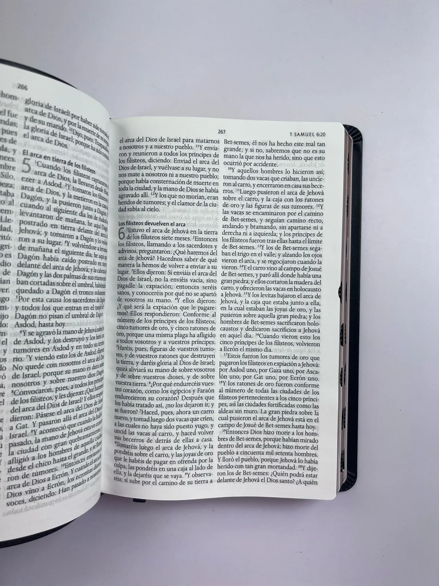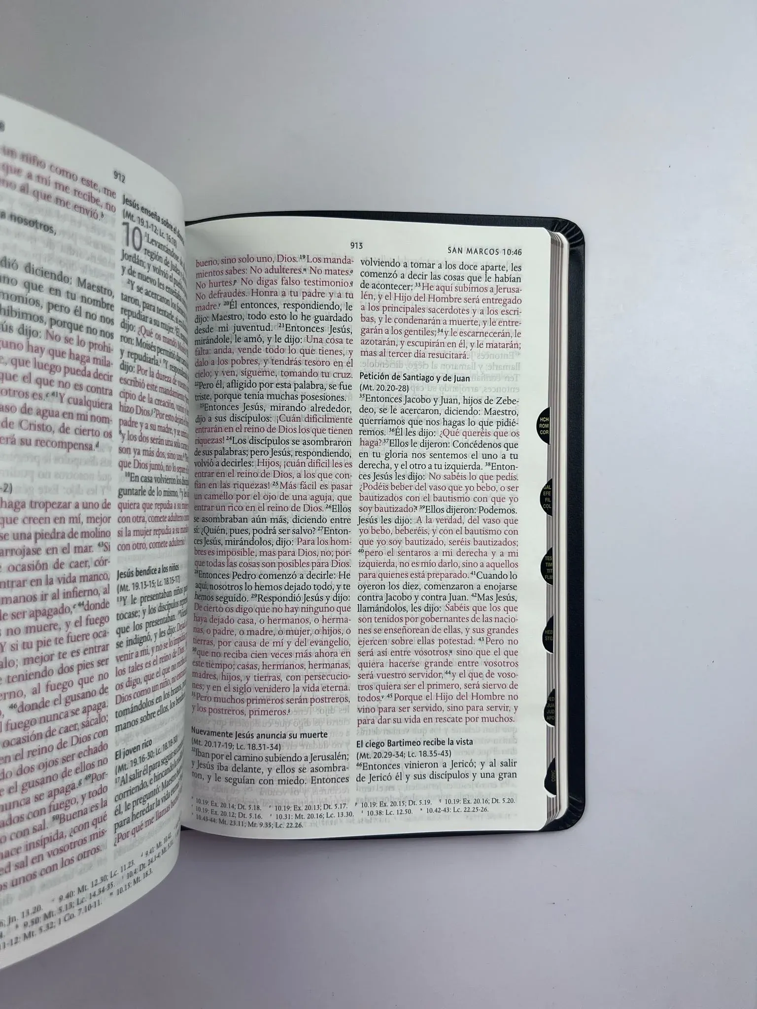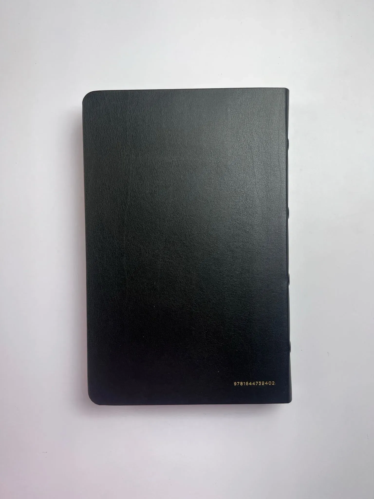 Biblia tamaño manual, ultrafina y con letra grande. Piel Premier negra con índice en una caja de presentación, con cinta marcadora y fotos a color de Tierra Santa.