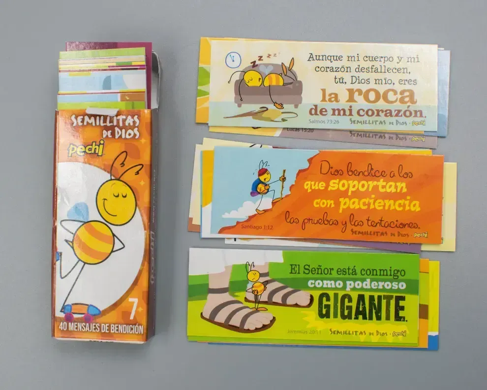 Cada cajita trae 40 tarjetitas diferentes, todos con versículos bíblicos hermosos, que cae como una semillita a nuestros corazones necesitados de esa palabra divina. Mide 8.2 cm de ancho por 3.1 cm de alto, viene empacado de bolsita con hueco para colgar.