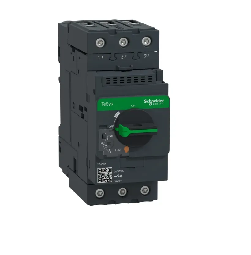 disyuntor motor GV TeSys, 3 polos (3P), 25 A/690V, para aplicaciones de motores trifásicos 11kW@4V. Proporciona protección térmica-magnética con un rango de ajuste térmico de 17-25 A, disparo magnético a 14xIn, alta capacidad de corte Icu 100kA@400V. Conexión mediante terminales de borne atornillado...