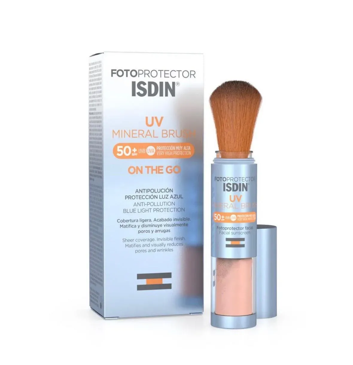 Beneficios: Fotoprotector facial en brocha que ofrece protección contra la luz azul, efecto antipolución y alta protección SPF 50+ frente a la radiación UVB y UVA.