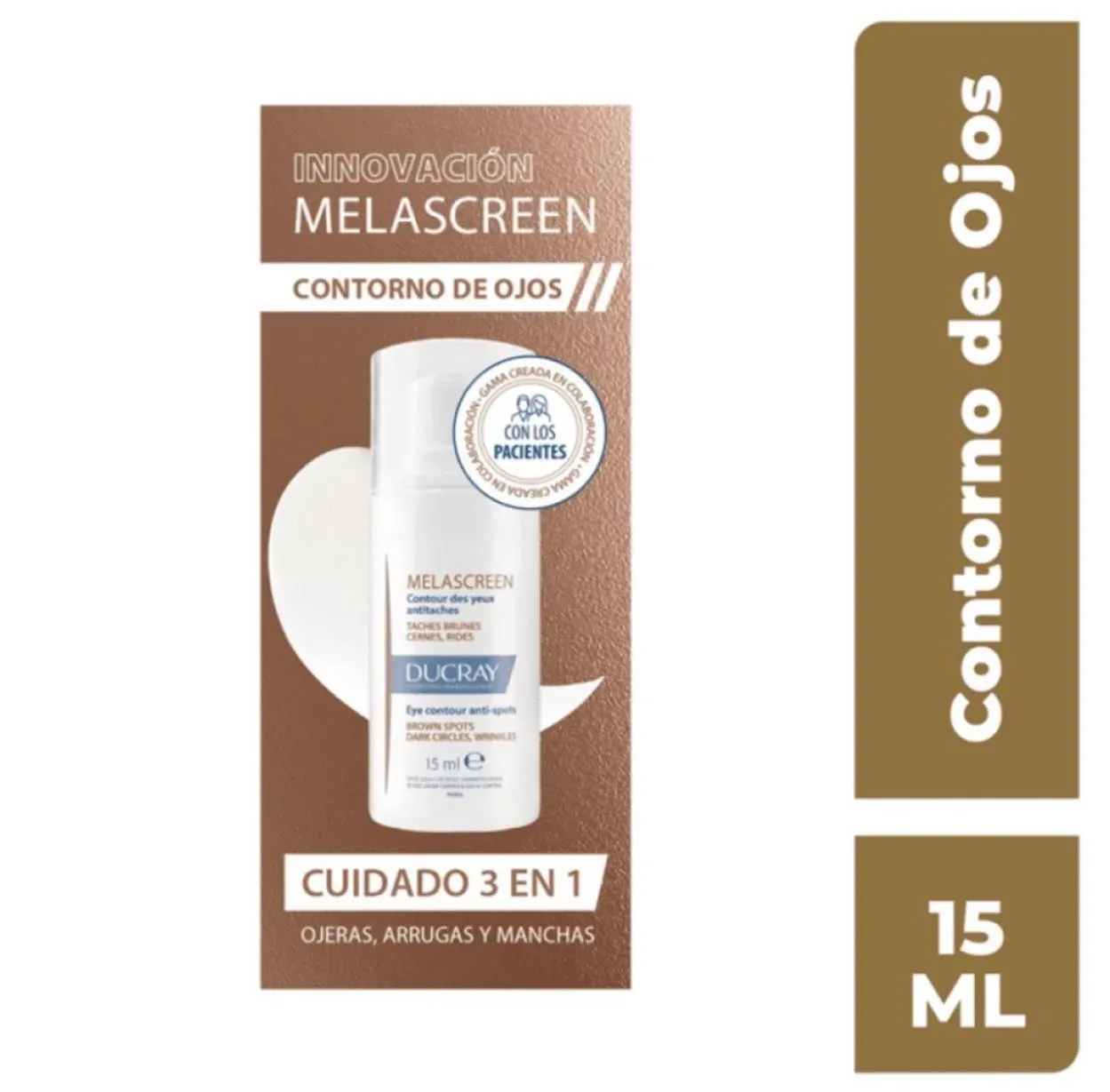 Melascreen Contorno de Ojos 15ML, es una crema de cuidado 3 en 1 especialmente desarrollado para esta zona sensible del contorno de los ojos, para actuar directamente sobre las manchas oscuras, las ojeras azules/oscuras y las arrugas a diario.