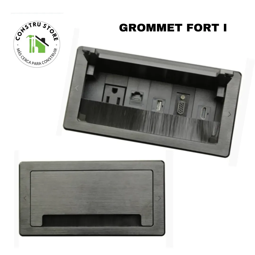 Cubierta en aluminio cepillado con sistema de autofrenado con cerdas sintéticas evitando la exposición al polvo. Conexiones se pueden configurar. Para mesas de juntas, escritorios, paredes. Sin cables a la vista.