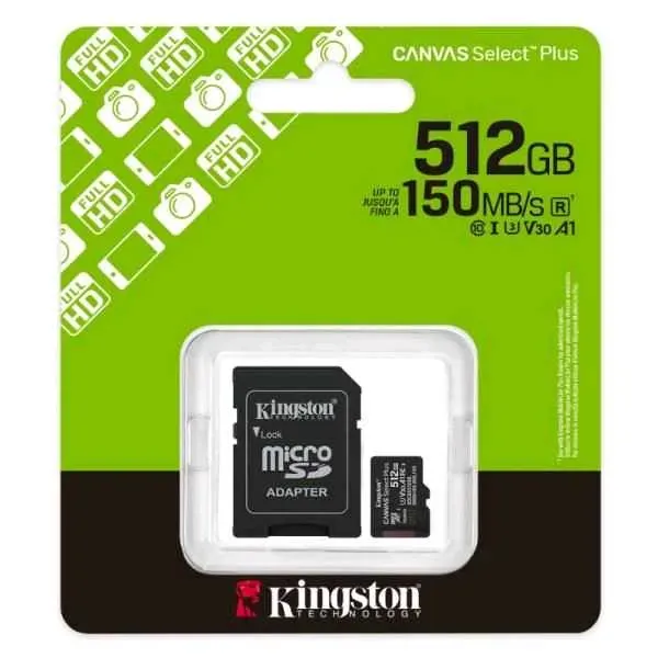MEMORIA MICRO SD 512GB KINGSTON CLASE 10 UHS-I U3 150 MB/S PARA DISPOSITIVOS Y CAMARAS ANDROID SDCS3/512GB NEGRO
