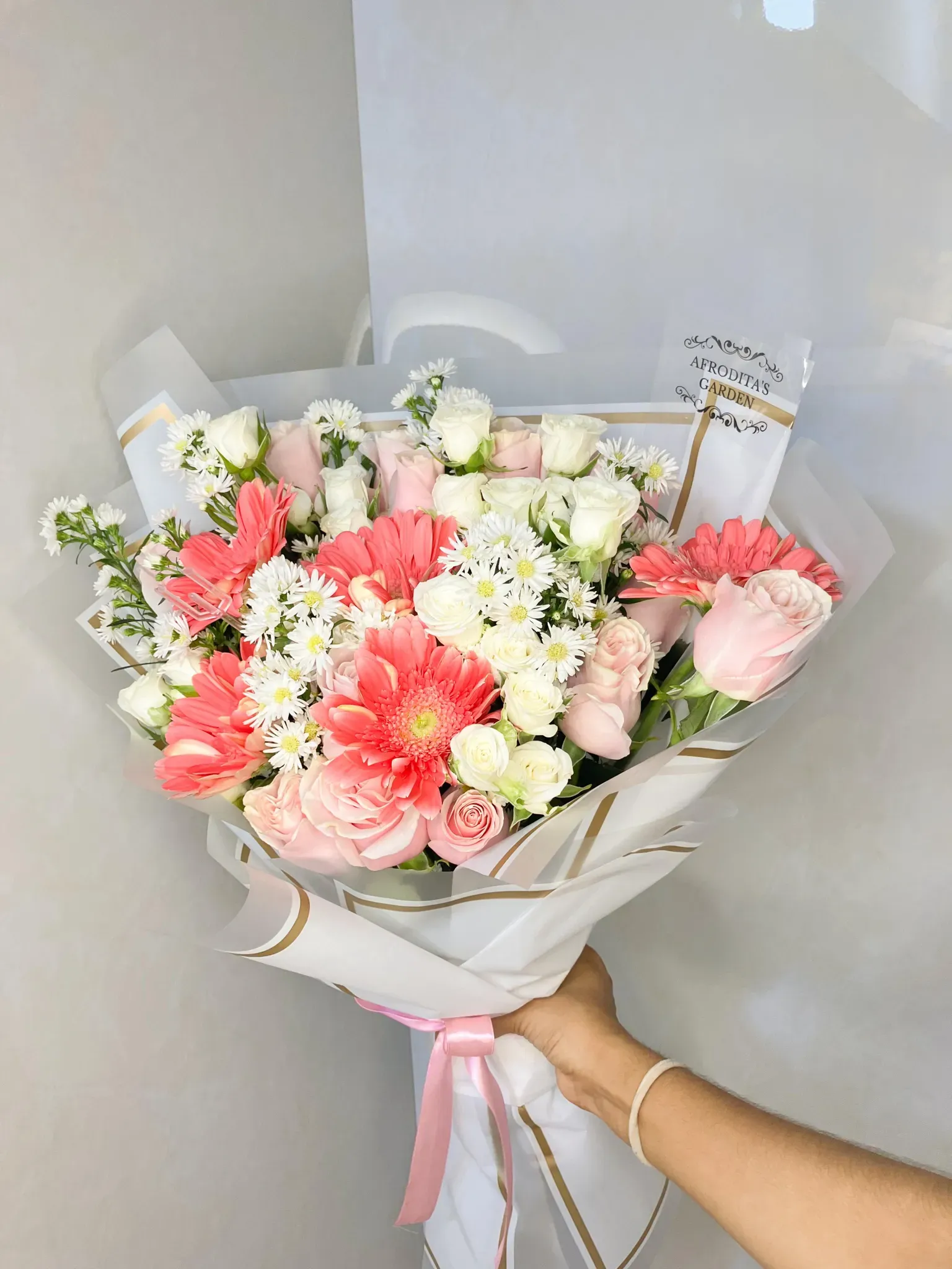 Delicada sinfonía floral que combina la alegría vibrante de las gerberas, la dulzura silvestre de los asters y la elegancia atemporal de las rosas y mini rosas.