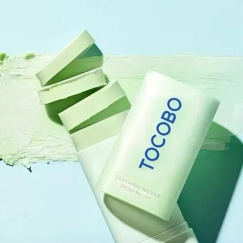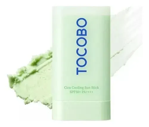 • El protector solar verde de Tocobo, conocido como Cica Cooling Sun Stick, es una barra solar refrescante y calmante con FPS50+ PA++++.