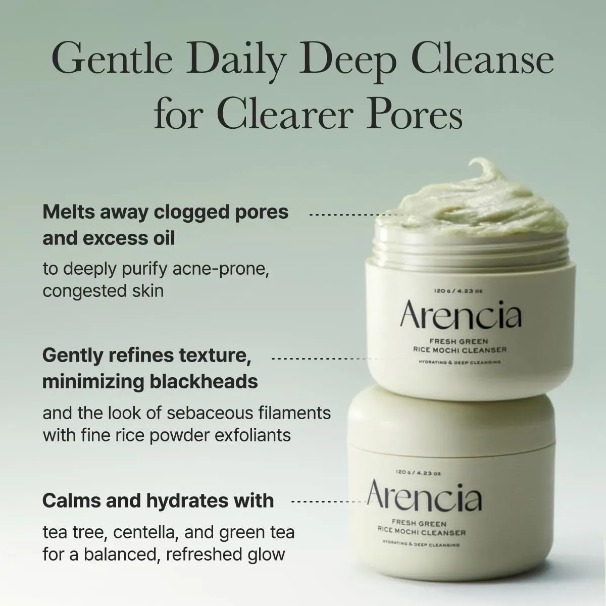 • El Arencia Fresh Green Rice Mochi Cleanser es un limpiador facial coreano 3 en 1 de textura elástica única, similar al mochi, diseñado para limpiar profundamente, exfoliar suavemente y nutrir la piel.