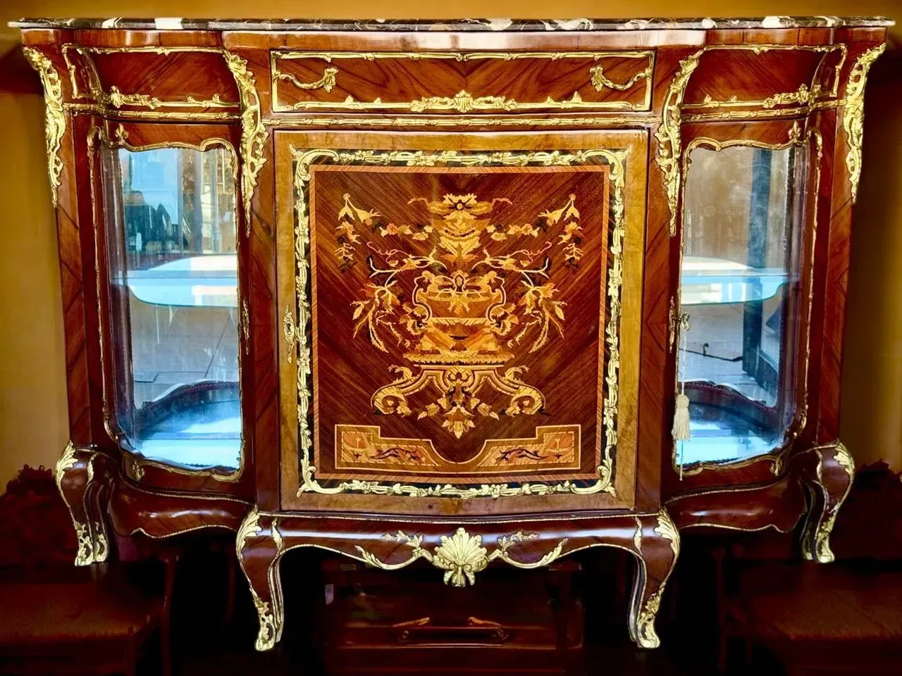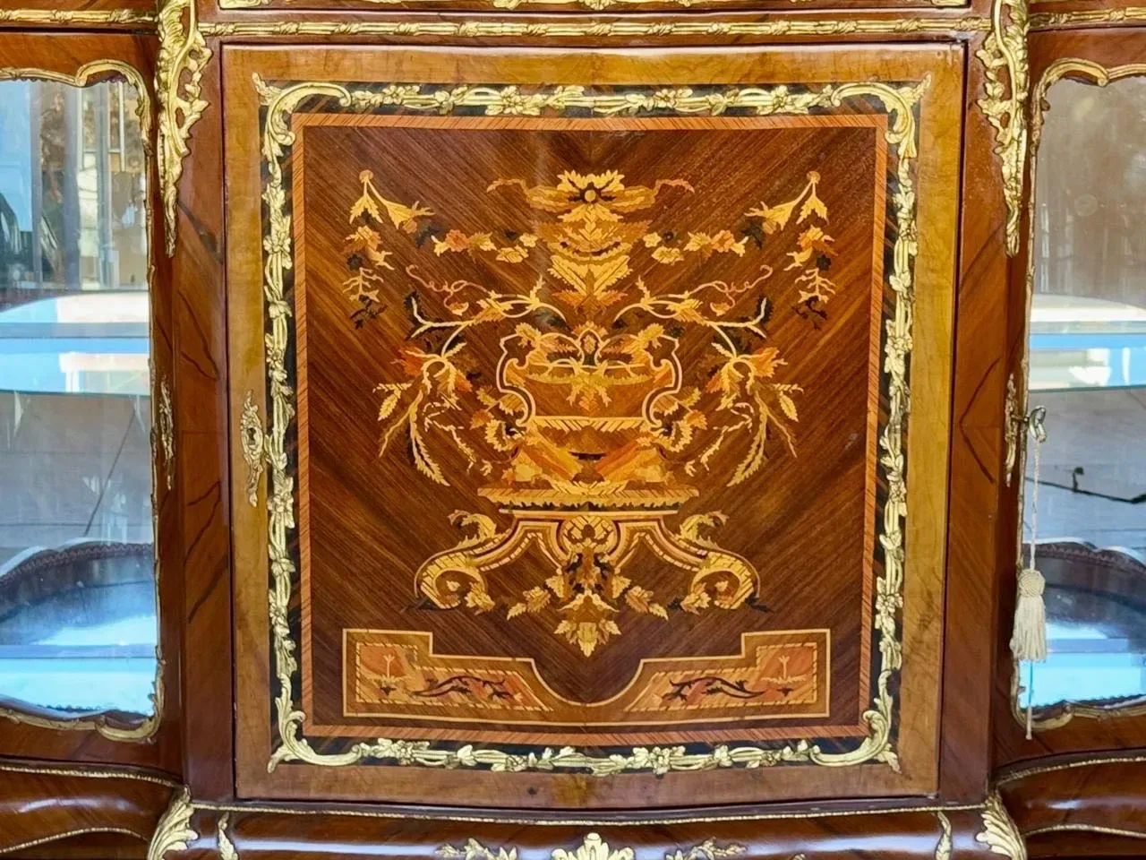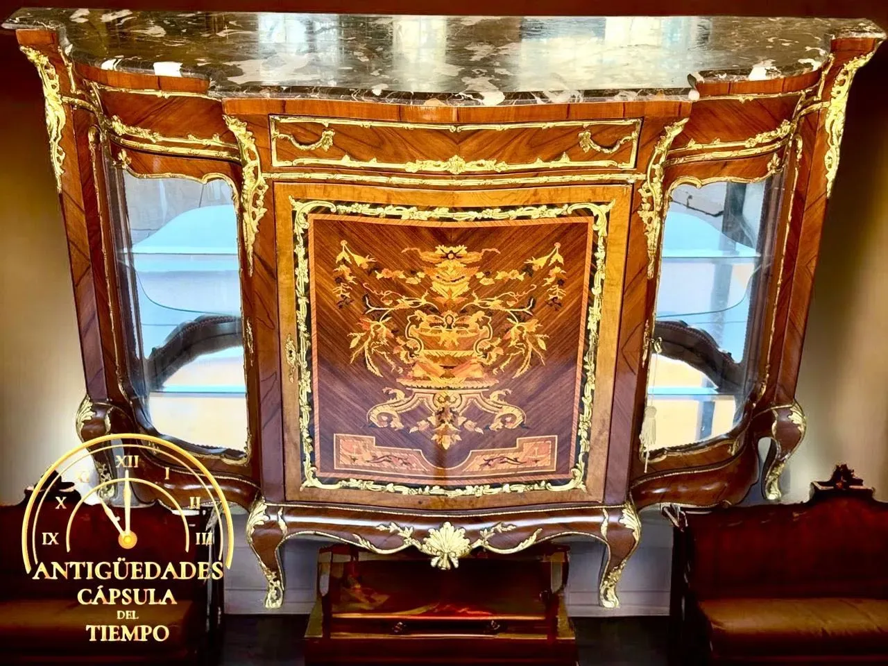 ⚜️ESPLÉNDIDO GABINETE/ APARADOR⚜️S.XX. ESTILO LUIS XV⚜️ CREADO EN MADERAS EXÓTICAS CON EXQUISITA MARQUETERÍA CON MOTIVOS NATURALES Y FLORALES Y CHAPA DE RAÍZ ⚜️SU FRENTE SE CARACTERIZA POR PUERTA BATIENTE Y CAJÓN ENRIQUISIDOS POR INSERCIONES EN BRONCE⚜️ LATERALES BOMBE CON CRISTALES BISELADOS⚜️⚜️S...
