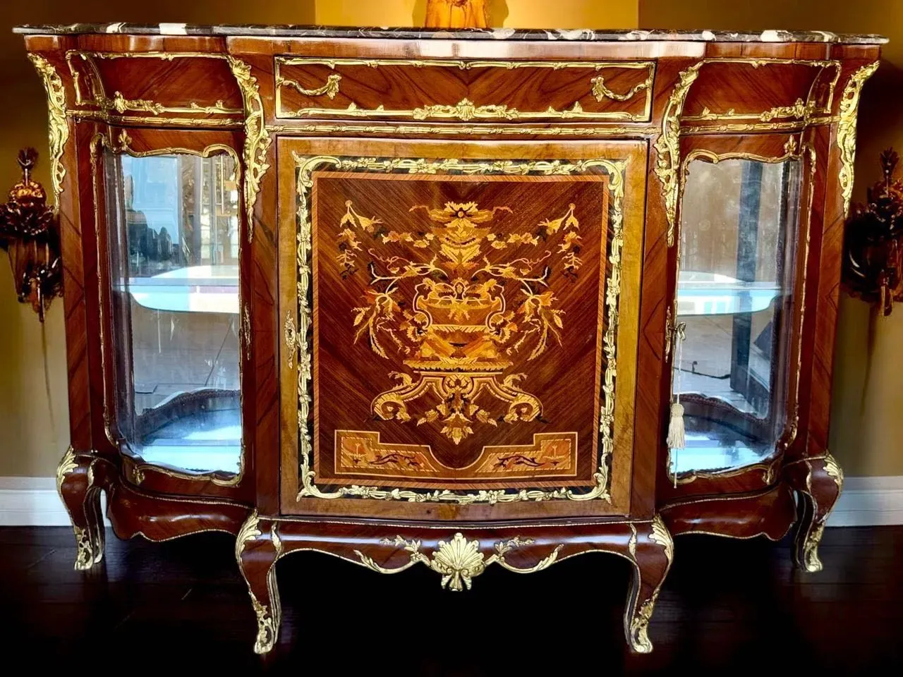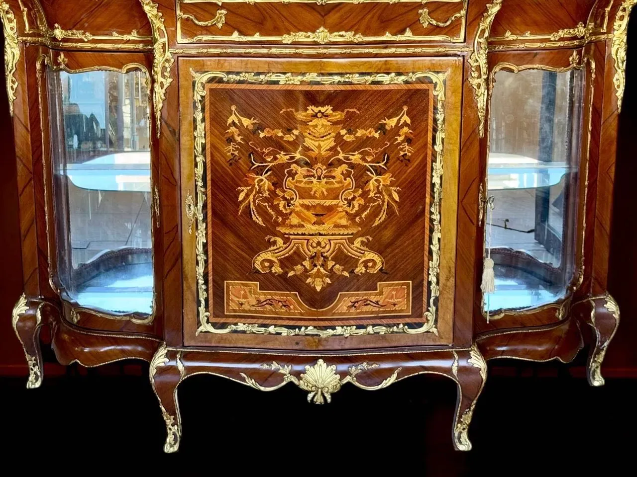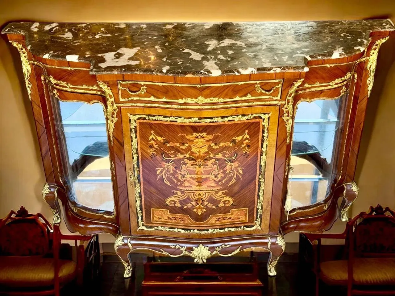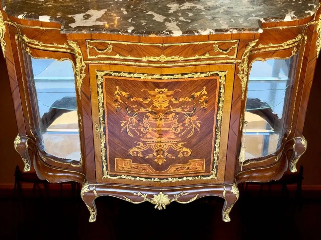 ⚜️ESPLÉNDIDO GABINETE/ APARADOR⚜️S.XX. ESTILO LUIS XV⚜️ CREADO EN MADERAS EXÓTICAS CON EXQUISITA MARQUETERÍA CON MOTIVOS NATURALES Y FLORALES Y CHAPA DE RAÍZ ⚜️SU FRENTE SE CARACTERIZA POR PUERTA BATIENTE Y CAJÓN ENRIQUISIDOS POR INSERCIONES EN BRONCE⚜️ LATERALES BOMBE CON CRISTALES BISELADOS⚜️⚜️S...