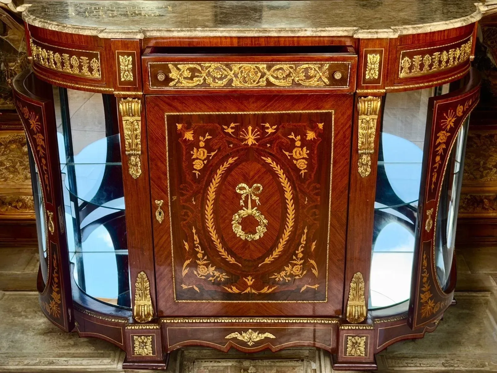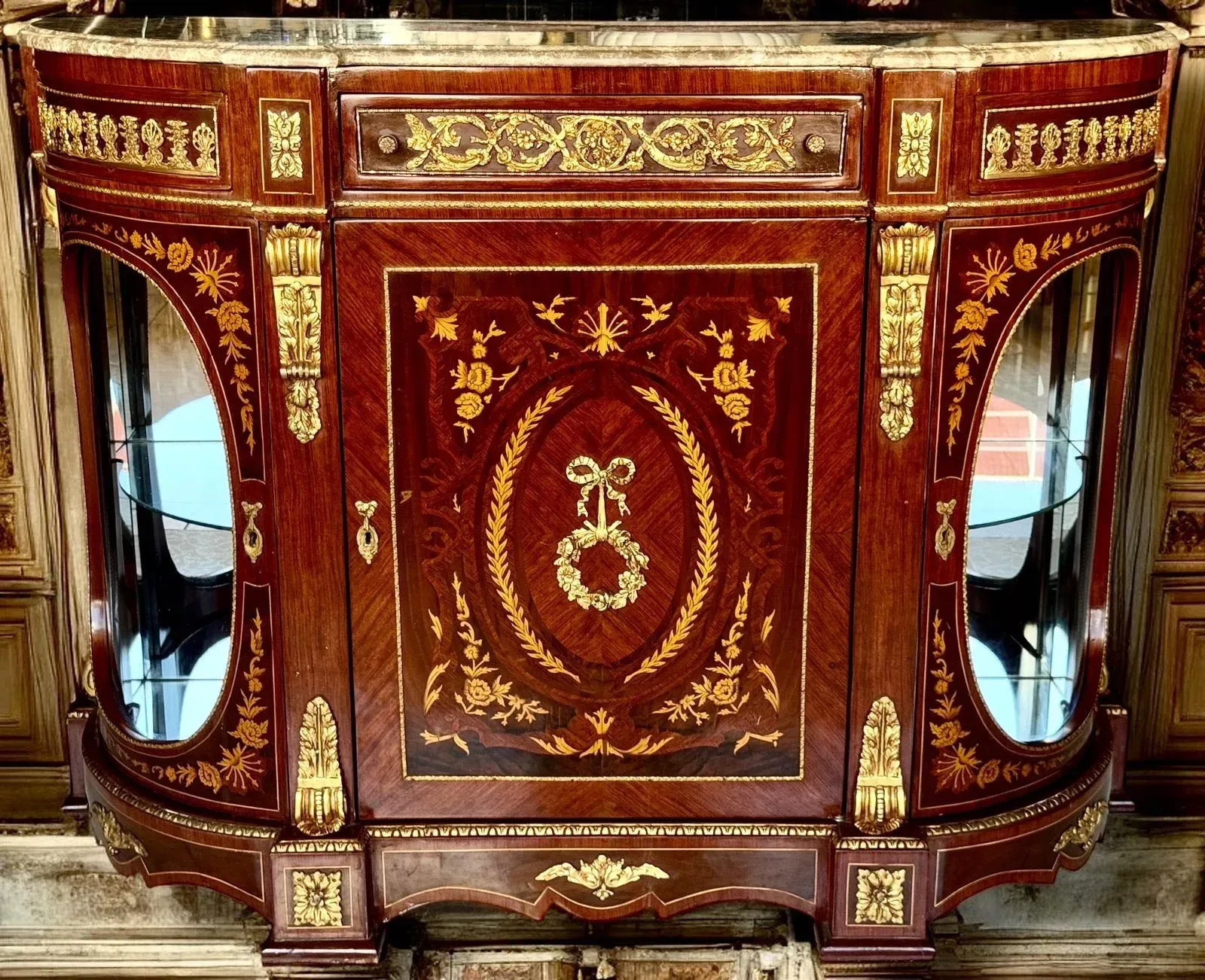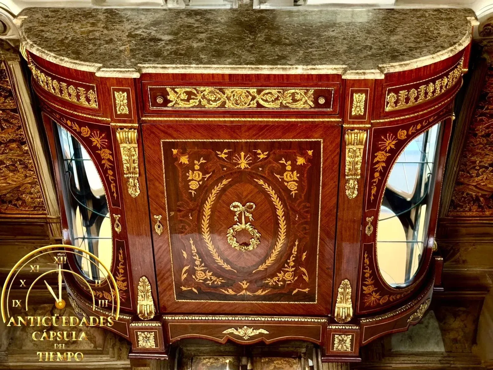 ⚜️BELLO APARADOR ESTILO NAPOLEÓN III⚜️ S.XX⚜️ REPOSA SOBRE UN PEDESTAL FESTONADO EN FORMA DE MEDIA LUNA ADORNADO CON BRONCES DORADOS “GUILLOCHE RINCEAU”, LE COMPLEMENTA 4 BLOQUES SALIENTES CON ROSETAS REMATADAS CON BANDAS DE HOJAS Y DARDOS.⚜️CENTRO EN MARQUETERÍA FLORAL RODEADO POR DETALLES EN BRON...