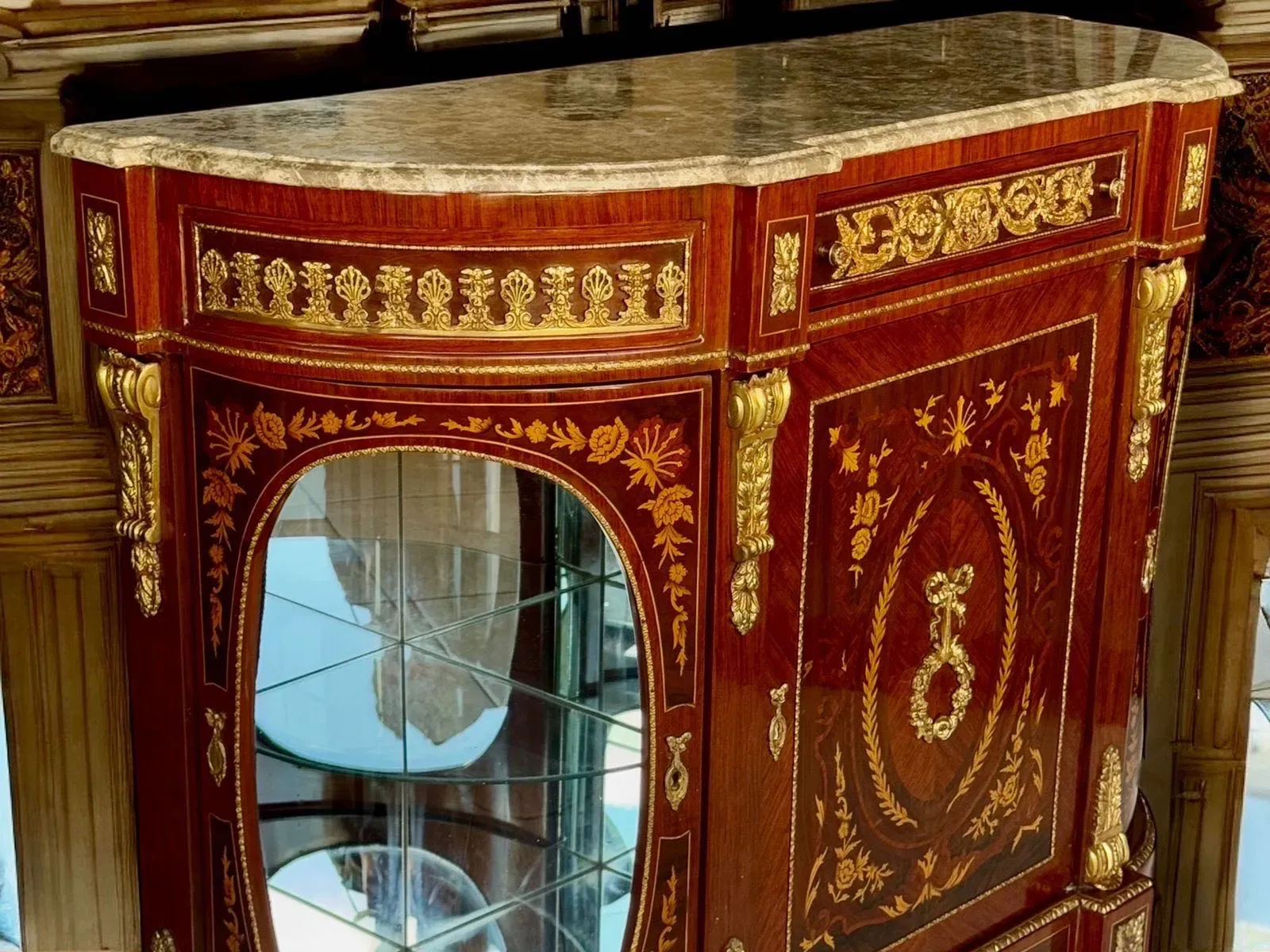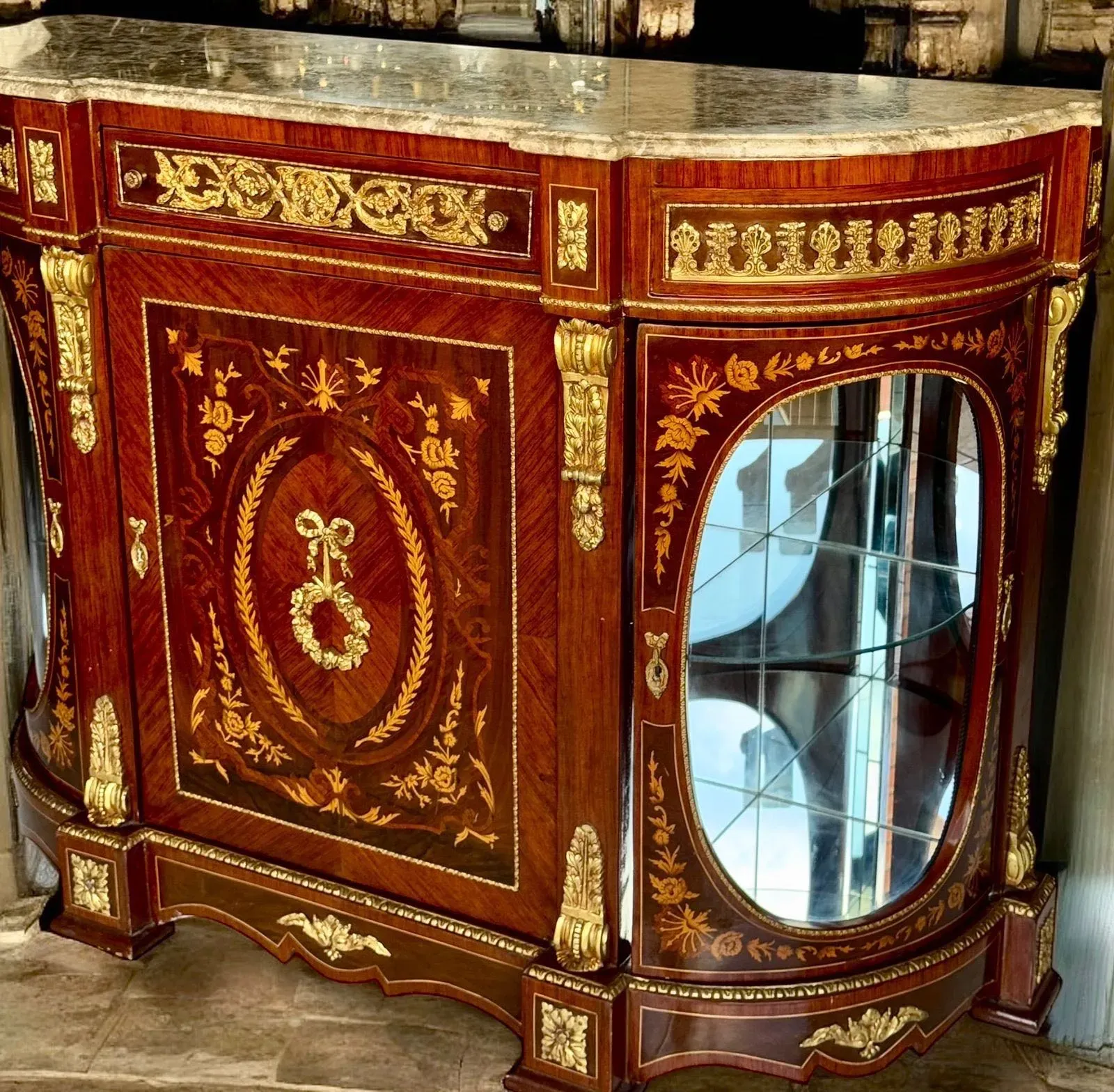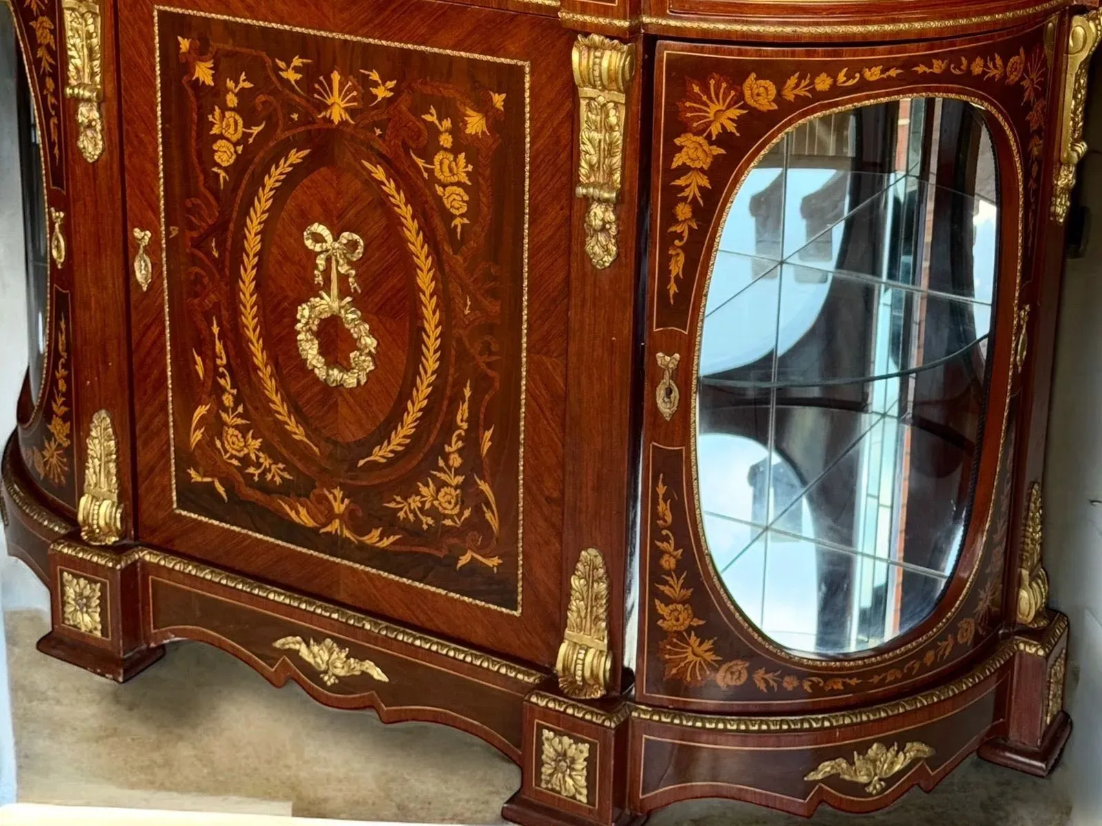 ⚜️BELLO APARADOR ESTILO NAPOLEÓN III⚜️ S.XX⚜️ REPOSA SOBRE UN PEDESTAL FESTONADO EN FORMA DE MEDIA LUNA ADORNADO CON BRONCES DORADOS “GUILLOCHE RINCEAU”, LE COMPLEMENTA 4 BLOQUES SALIENTES CON ROSETAS REMATADAS CON BANDAS DE HOJAS Y DARDOS.⚜️CENTRO EN MARQUETERÍA FLORAL RODEADO POR DETALLES EN BRON...