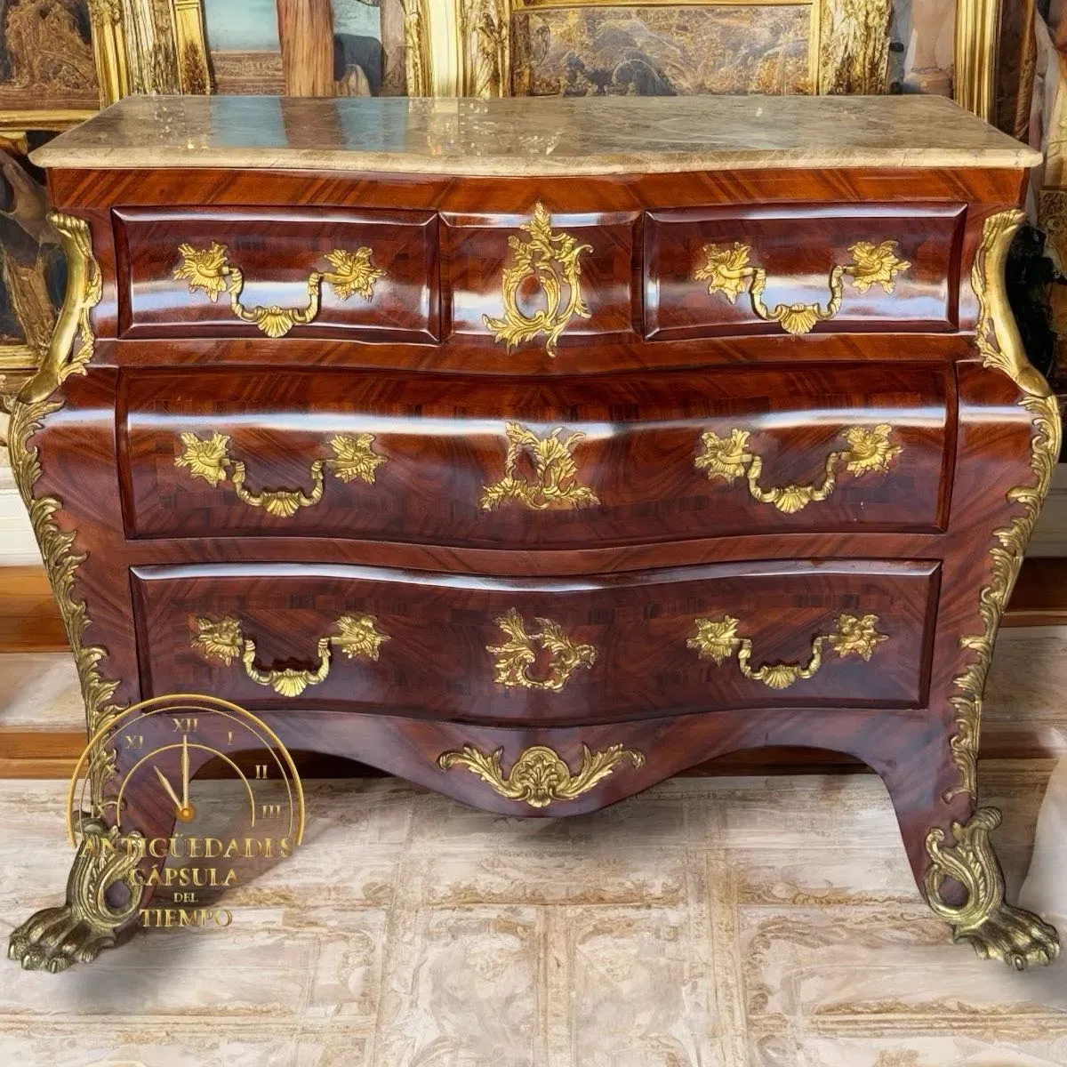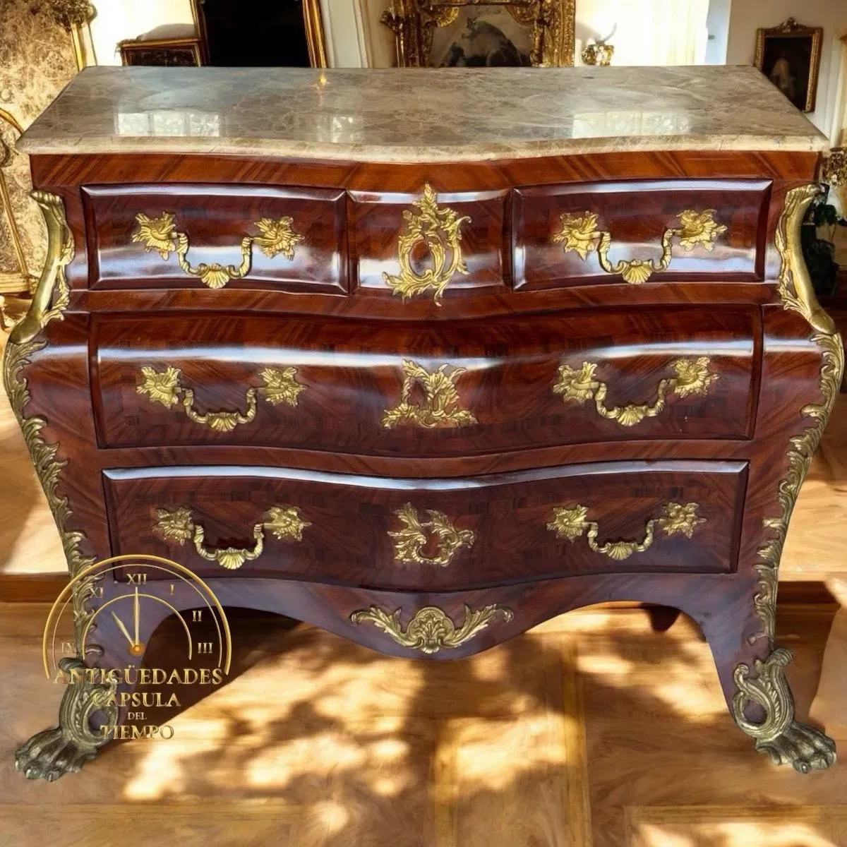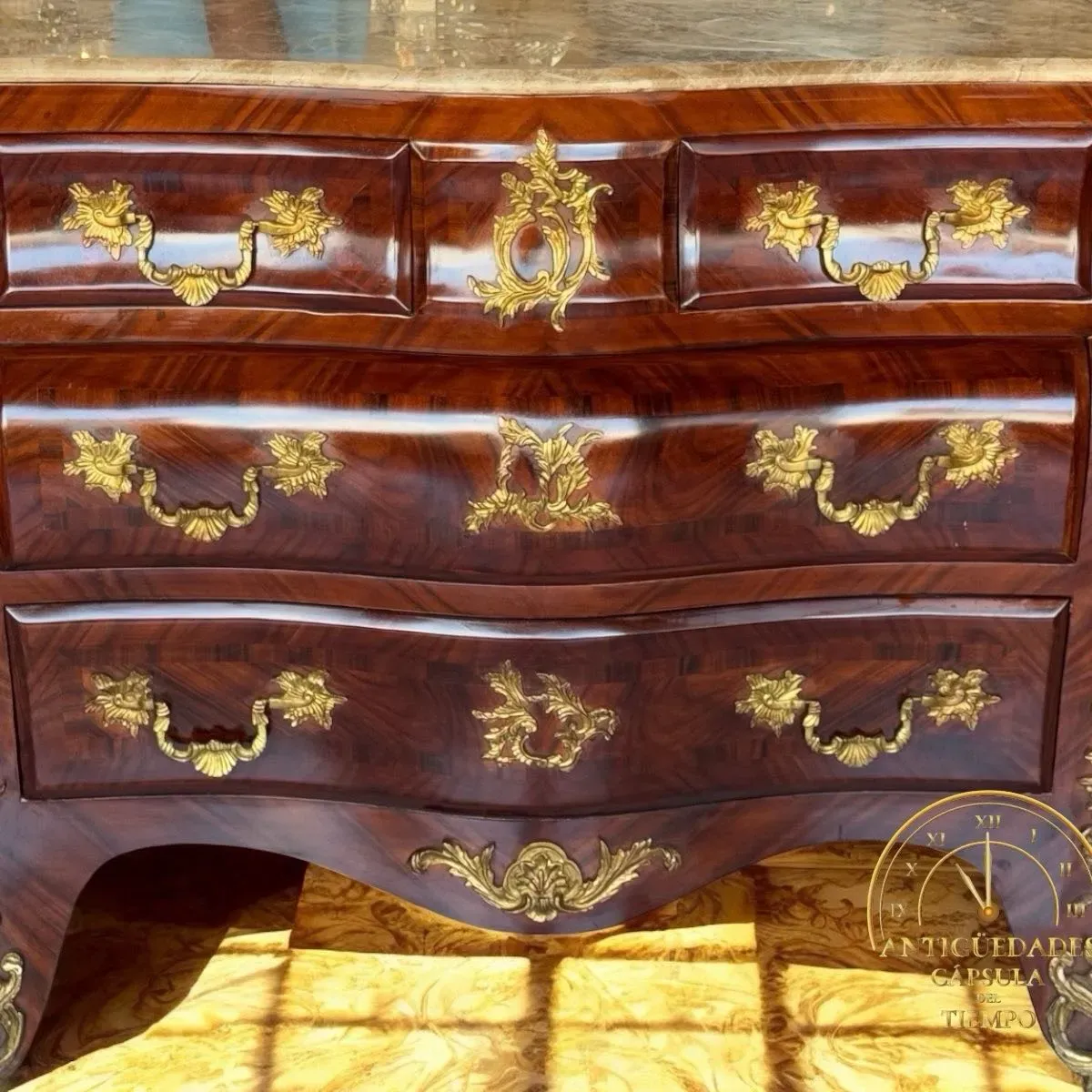 ⚜️CÓMODA A LA REGENCE⚜️ TOMBEAU / A MOUTACHE⚜️ HERMOSA CÓMODA EN MADERAS DE ROBLE Y CHAPAS DE PALISANDRO⚜️ LATERALES Y FRONTAL CURVOS ADORNADOS CON BRONCES DORADOS⚜️ SOPORTES EN PATAS DE LEÓN DE BRONCE ⚜️ BASE EN MÁRMOL⚜️