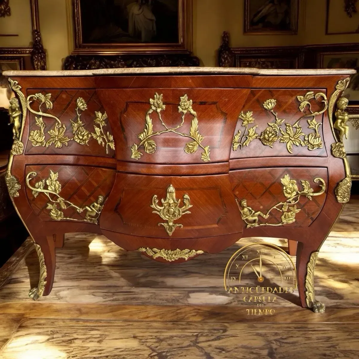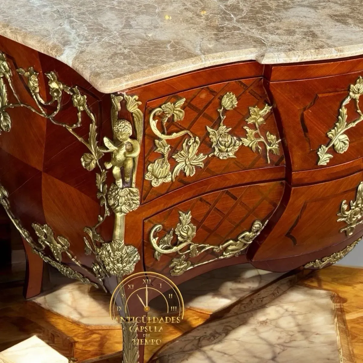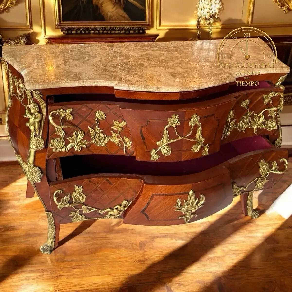 ⚜️INCREÍBLE COMODA FRANCESA INSPIRADA EN CHARLES CRESSENT⚜️ CREADA EN MADERAS DE TULIPAN Y MARQUETERÍA ⚜️ DECORADA CON RICAS MONTURAS EN BRONCE EN FORMA DE BANDAS FLORALES Y ACANTOS⚜️ ESQUINAS MONTADAS CON MOLDURAS DE QUERUBINES ⚜️ BASE EN MÁRMOL BRECHE⚜️