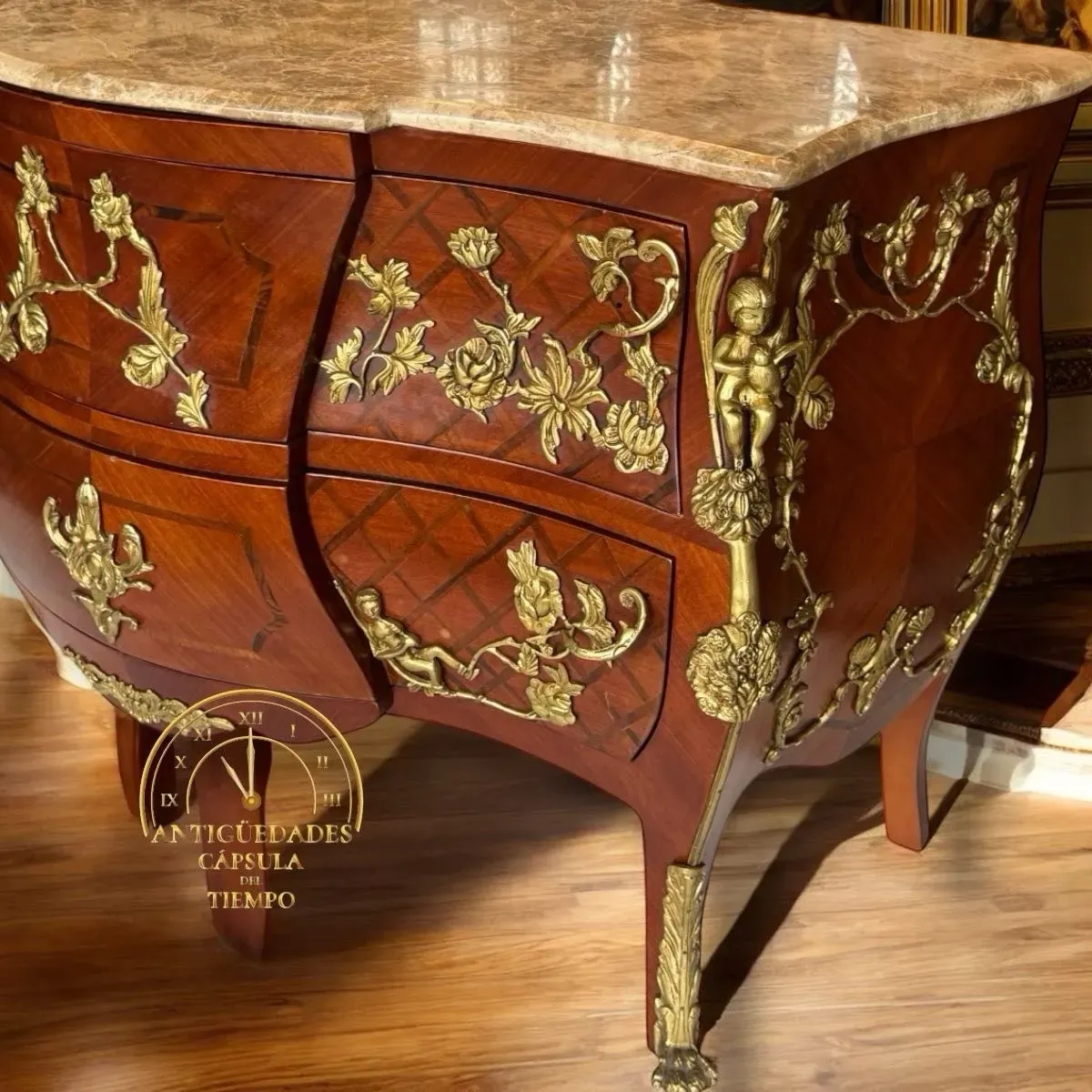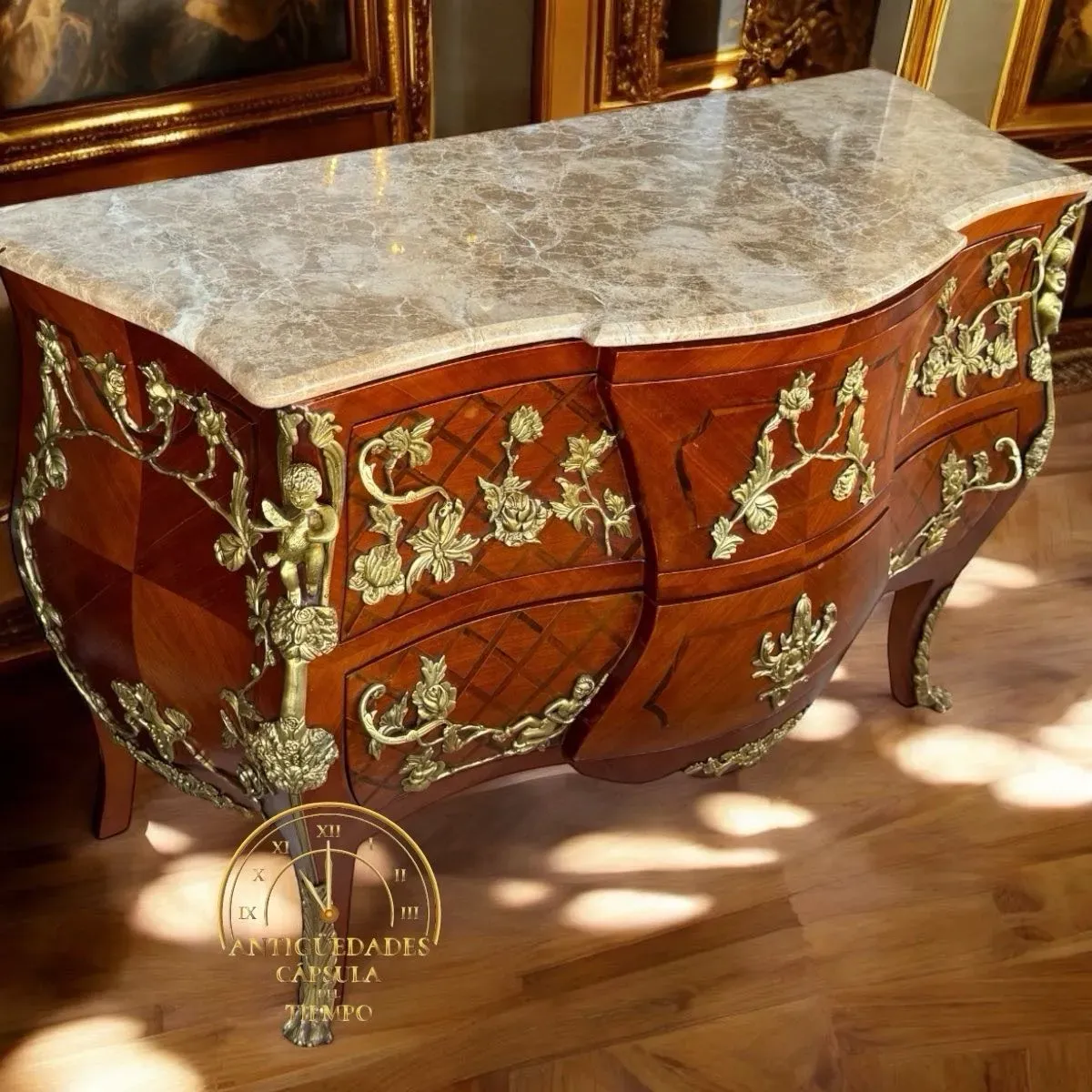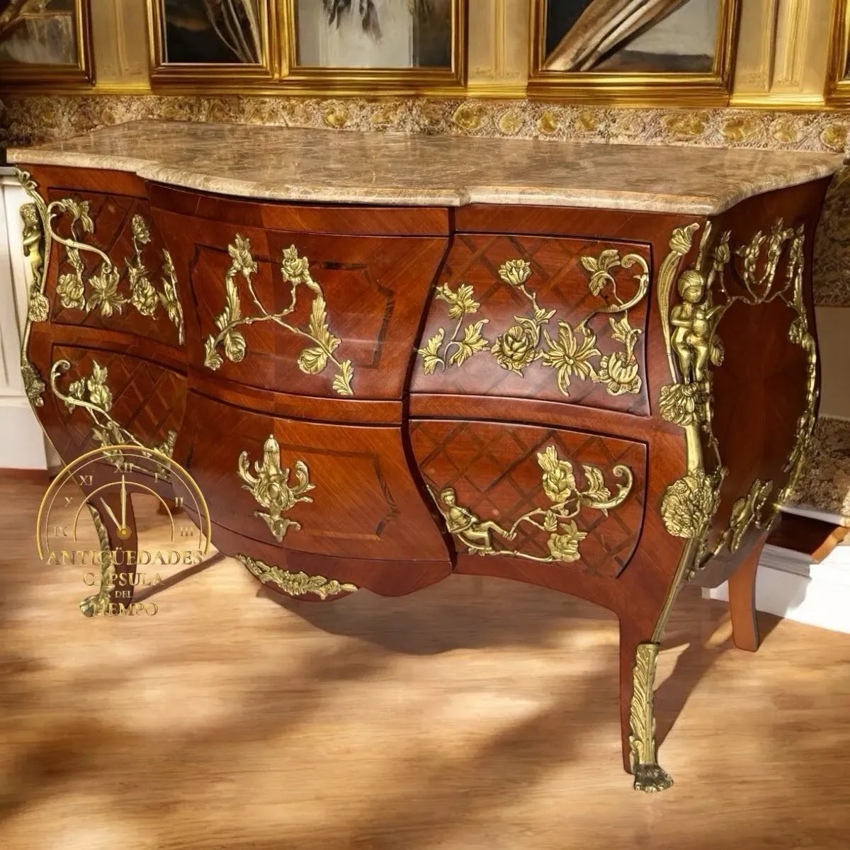 ⚜️INCREÍBLE COMODA FRANCESA INSPIRADA EN CHARLES CRESSENT⚜️ CREADA EN MADERAS DE TULIPAN Y MARQUETERÍA ⚜️ DECORADA CON RICAS MONTURAS EN BRONCE EN FORMA DE BANDAS FLORALES Y ACANTOS⚜️ ESQUINAS MONTADAS CON MOLDURAS DE QUERUBINES ⚜️ BASE EN MÁRMOL BRECHE⚜️