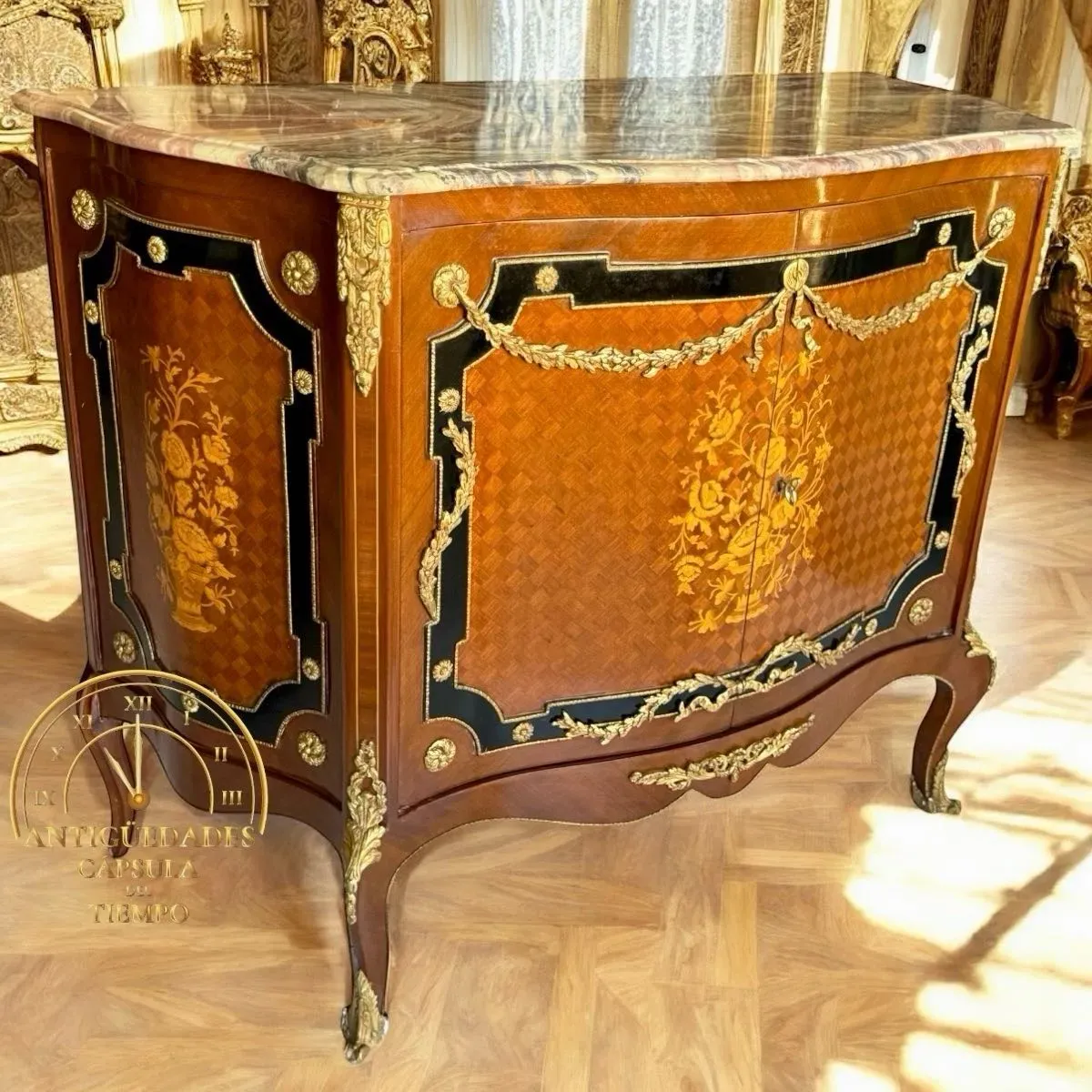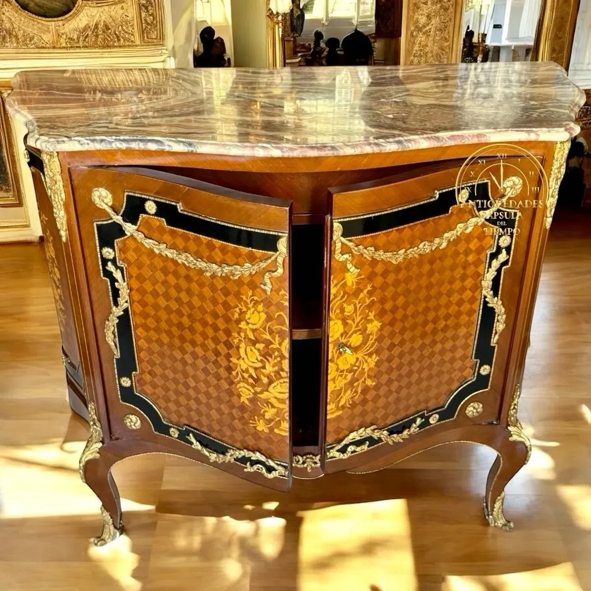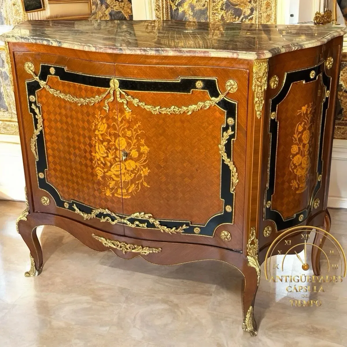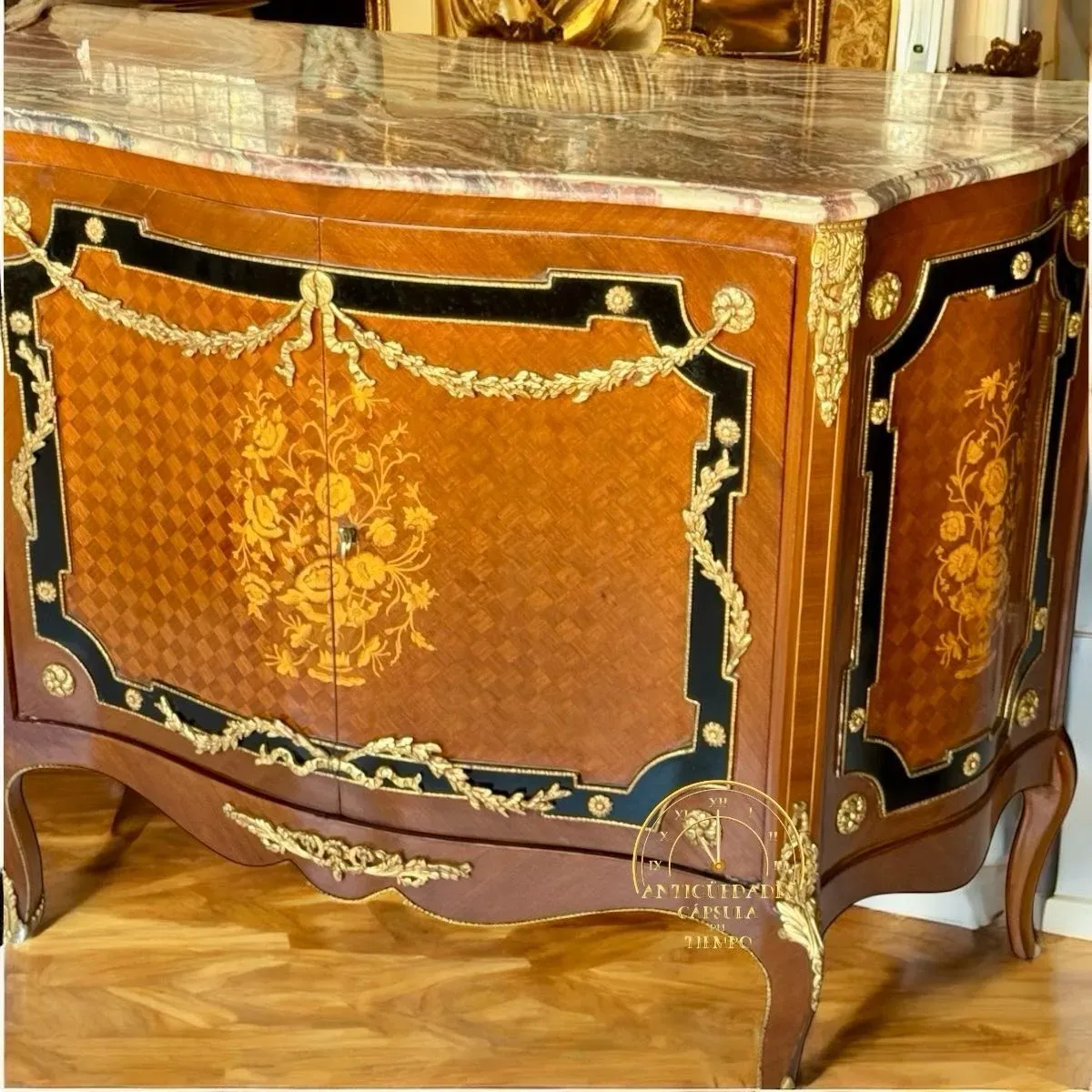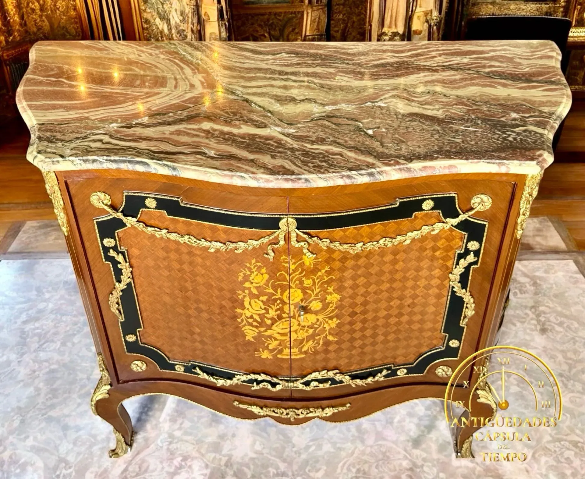 ⚜️ FRANCIA S.XX⚜️ ELEGANTE CÓMODA ESTILO NAPOLEÓN III⚜️ ELEVADO SOBRE PATAS EN FORMA DE TOPIE CON FINAS BANDAS ORMULU⚜️ HERMOSOS DISEÑOS RECTANGULARES DE NOGAL BURL ENMARCADOS, LA PUERTA CENTRAL PRESENTA EXQUISITAS INSCRUSTACIONES DE MARQUETERÍA CON ADORNOS DE ROSETAS EN BRONCE ⚜️REVELA DOS ESTANTE...
