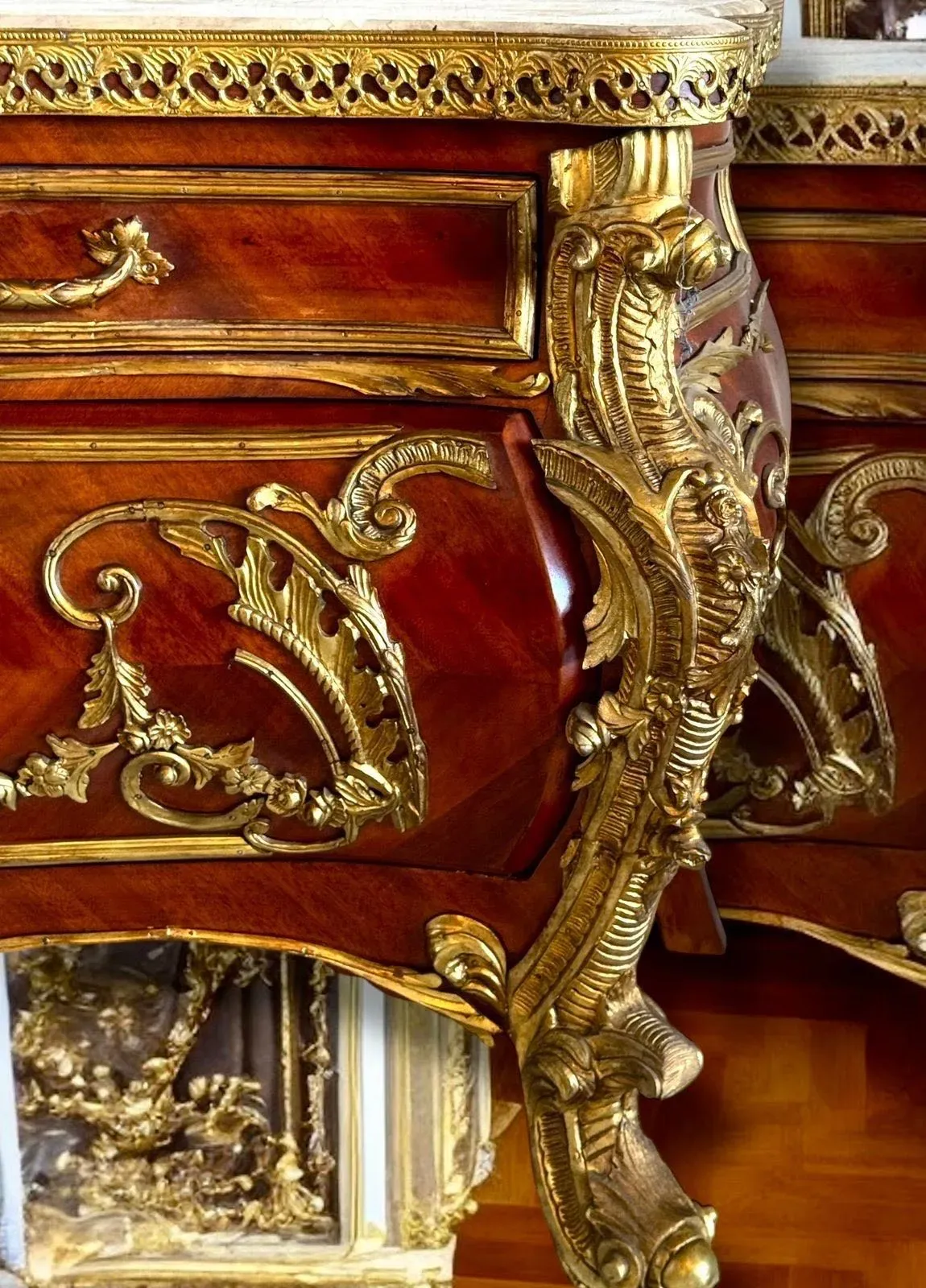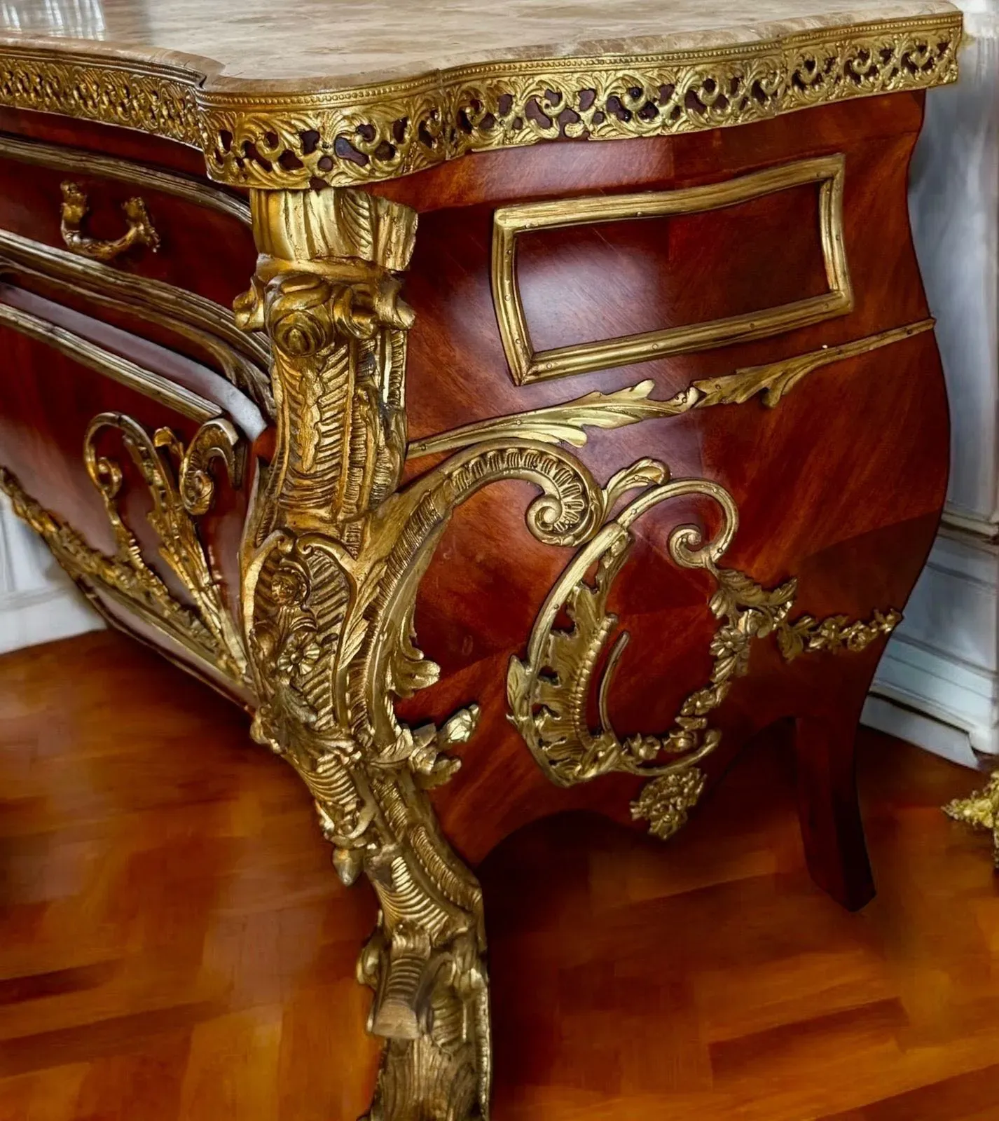 ⚜️MAGNÍFICA CÓMODA FRANCESA ⚜️S.XIX-S.XX⚜️ ESTILO ROCOCO SEGÚN FRANCOIS LINK “DESTACADO EBANISTA PARISINO. CREADA EN PALO DE ROSA DE FORMA CUEVILINEA Y BOMBE, REMATADA POR UN MARMOL CAMPAN PYRENEES VETEADO DENTRO DE UN MARCO EN BRONCE DORADO FUNDIDO CON BANDAS ENTRECRUZADAS Y CENTRADO POR UNA MASCA...