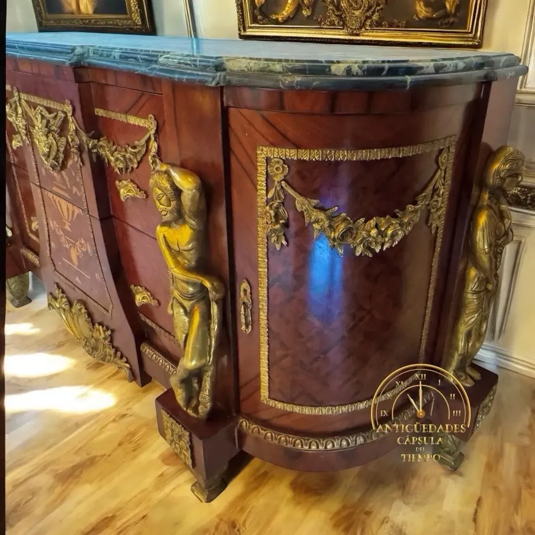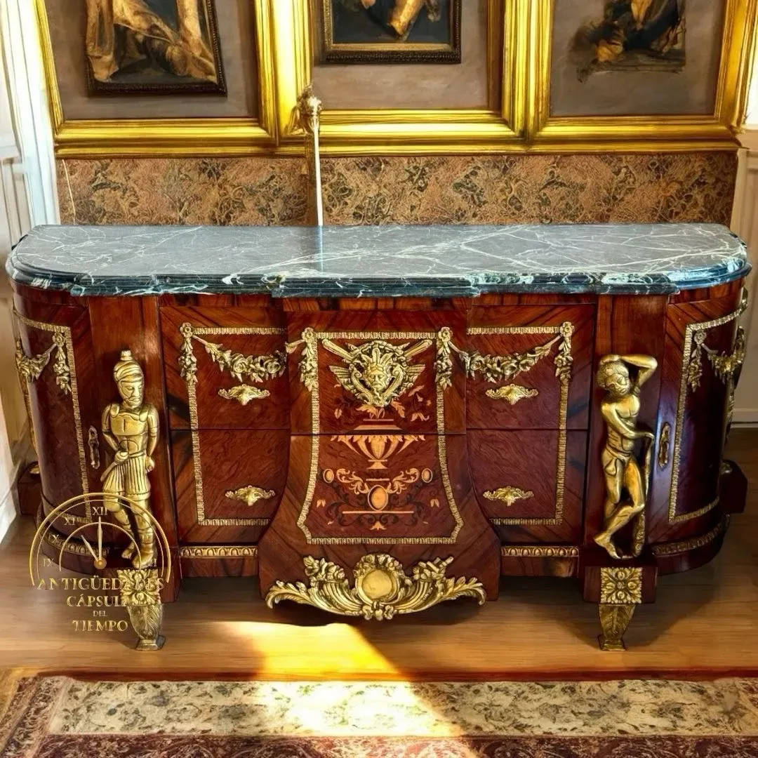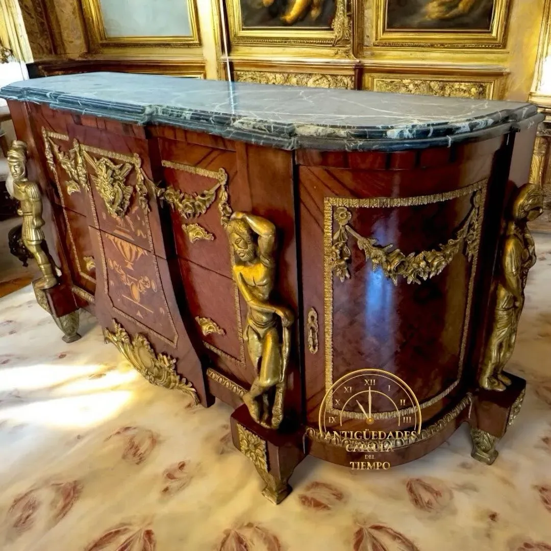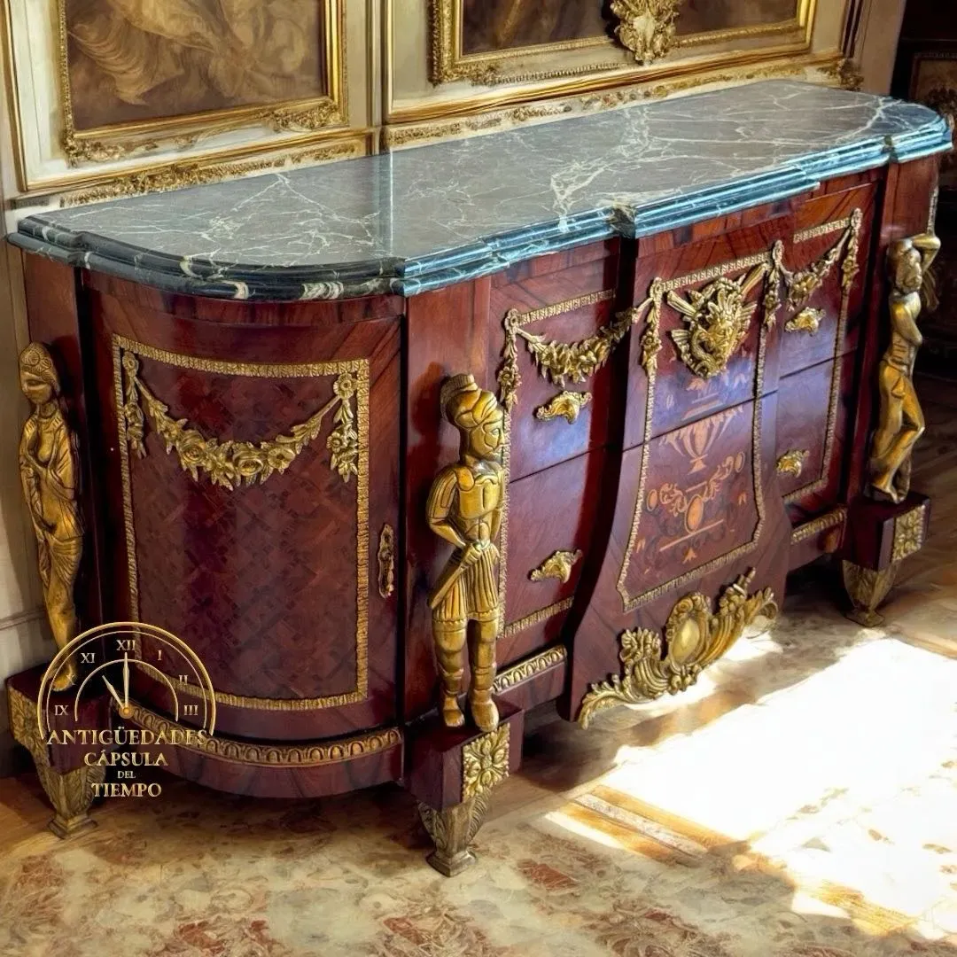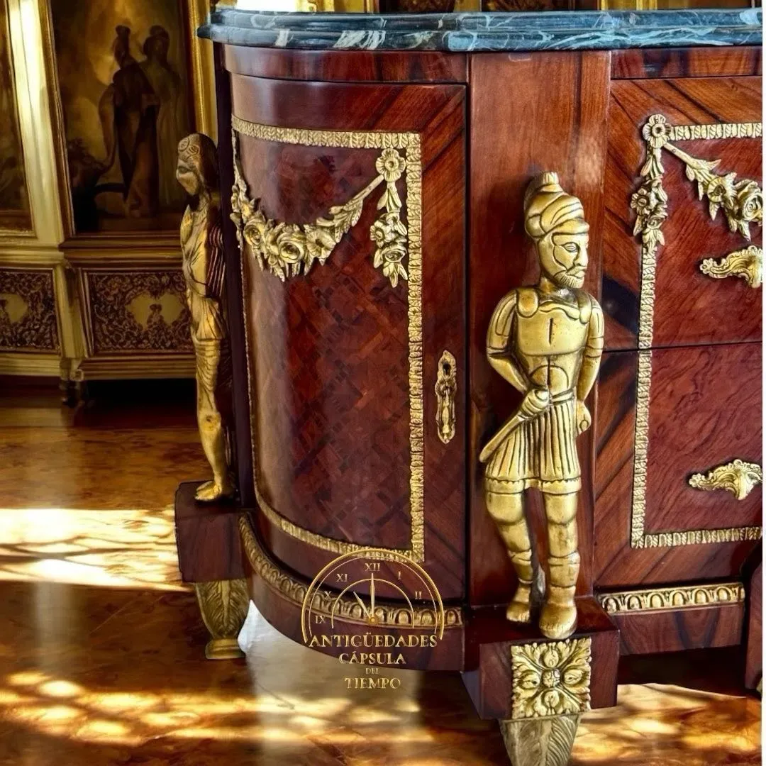 ⚜️GRAN GABINETE ESTILO JEAN RIESENER⚜️ S.XIX⚜️ INSPIRADO EN EBANISTA ALEMÁN ,ESTÁ INCREÍBLE PIEZA ESTÁ ELABORADA POR EXQUISITAS MADERAS, EN FORMA DE “D” EQUIPADO CON CAJONES CENTRALES Y PUERTAS LATERALES⚜️SOBRE EL DESCANZA GRAN PEANA EN MÁRMOL BETADO VERDE⚜️ADORNADO EN SUS LATERALES CON GRANDES ESCU...