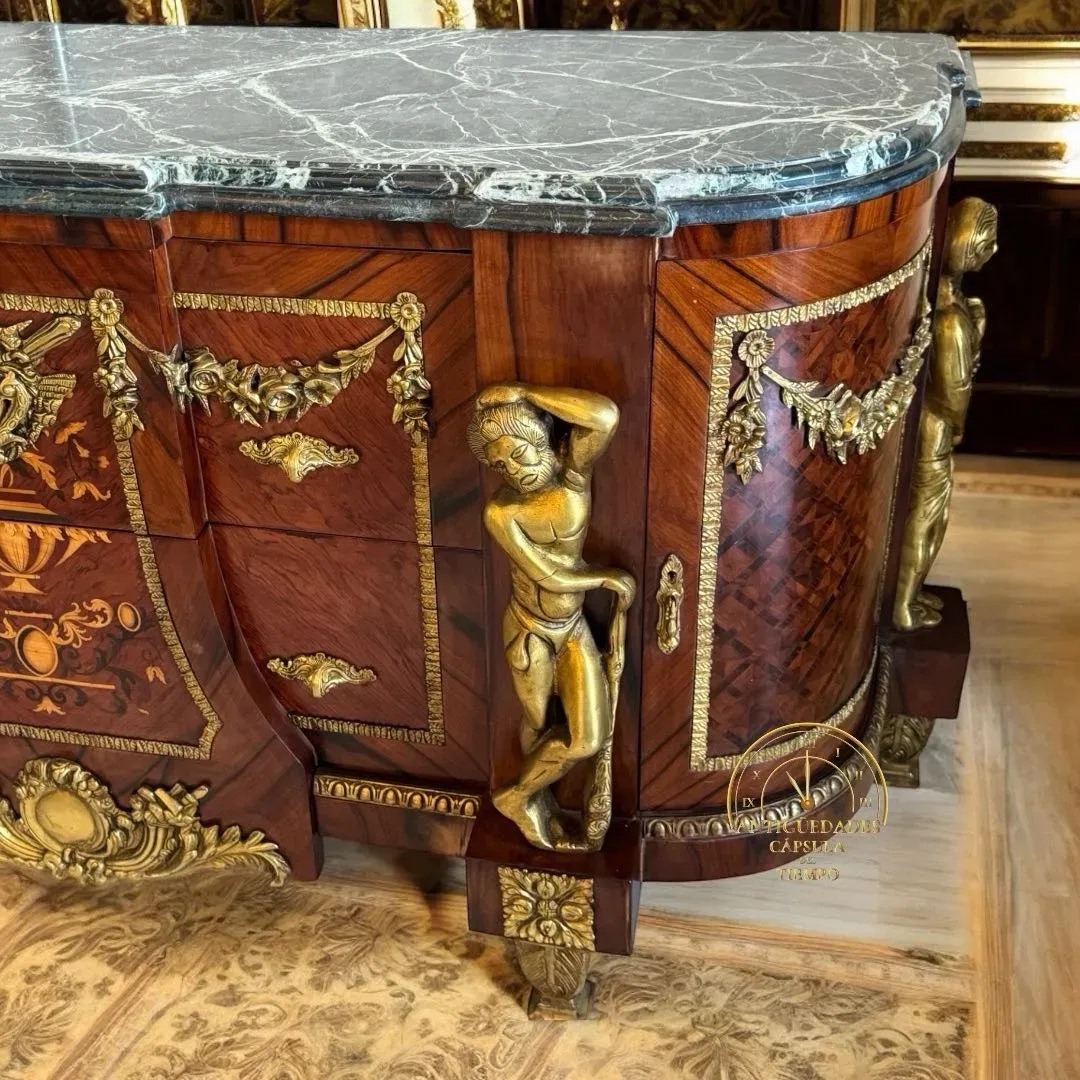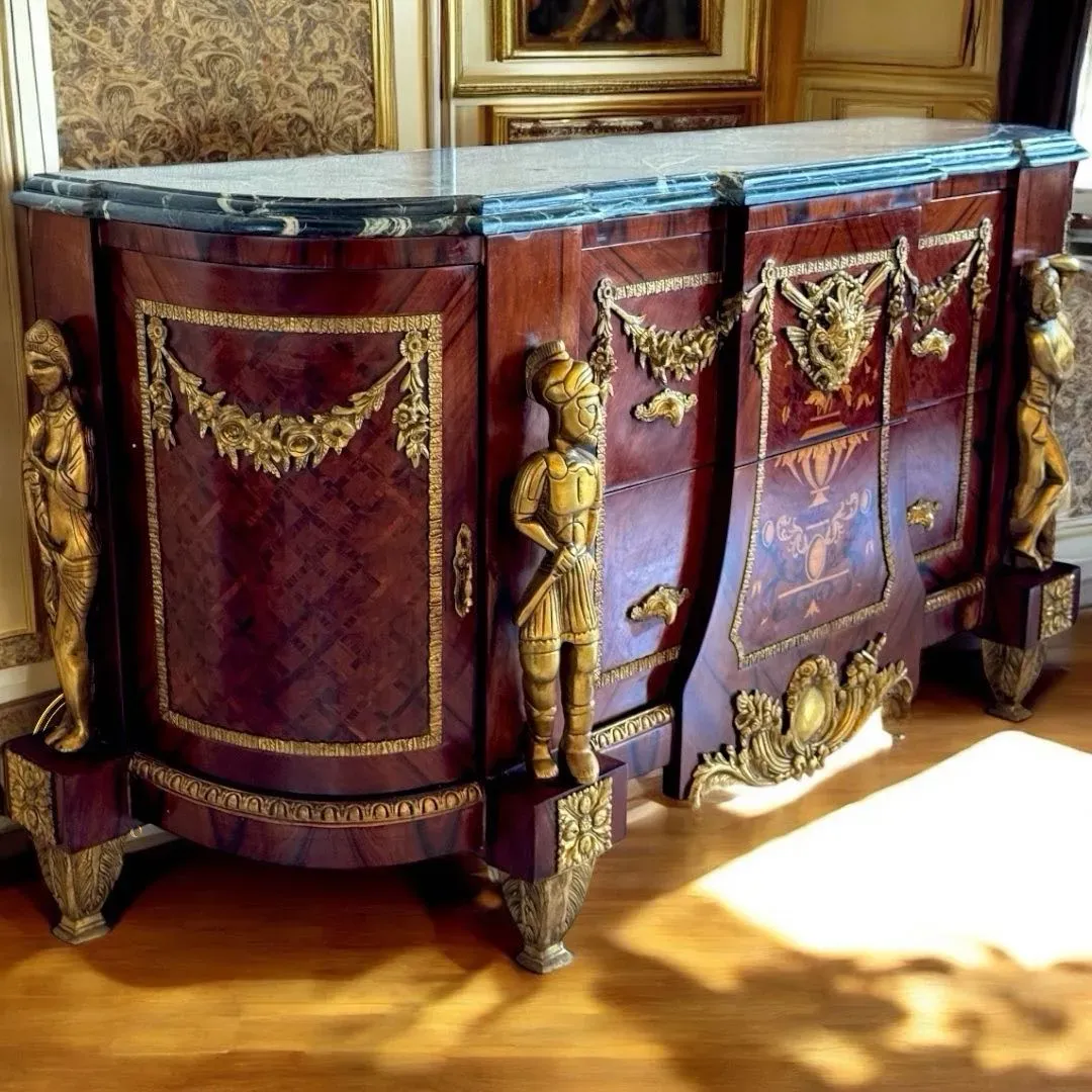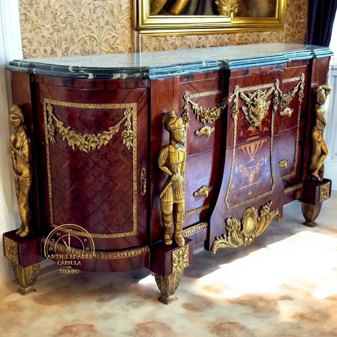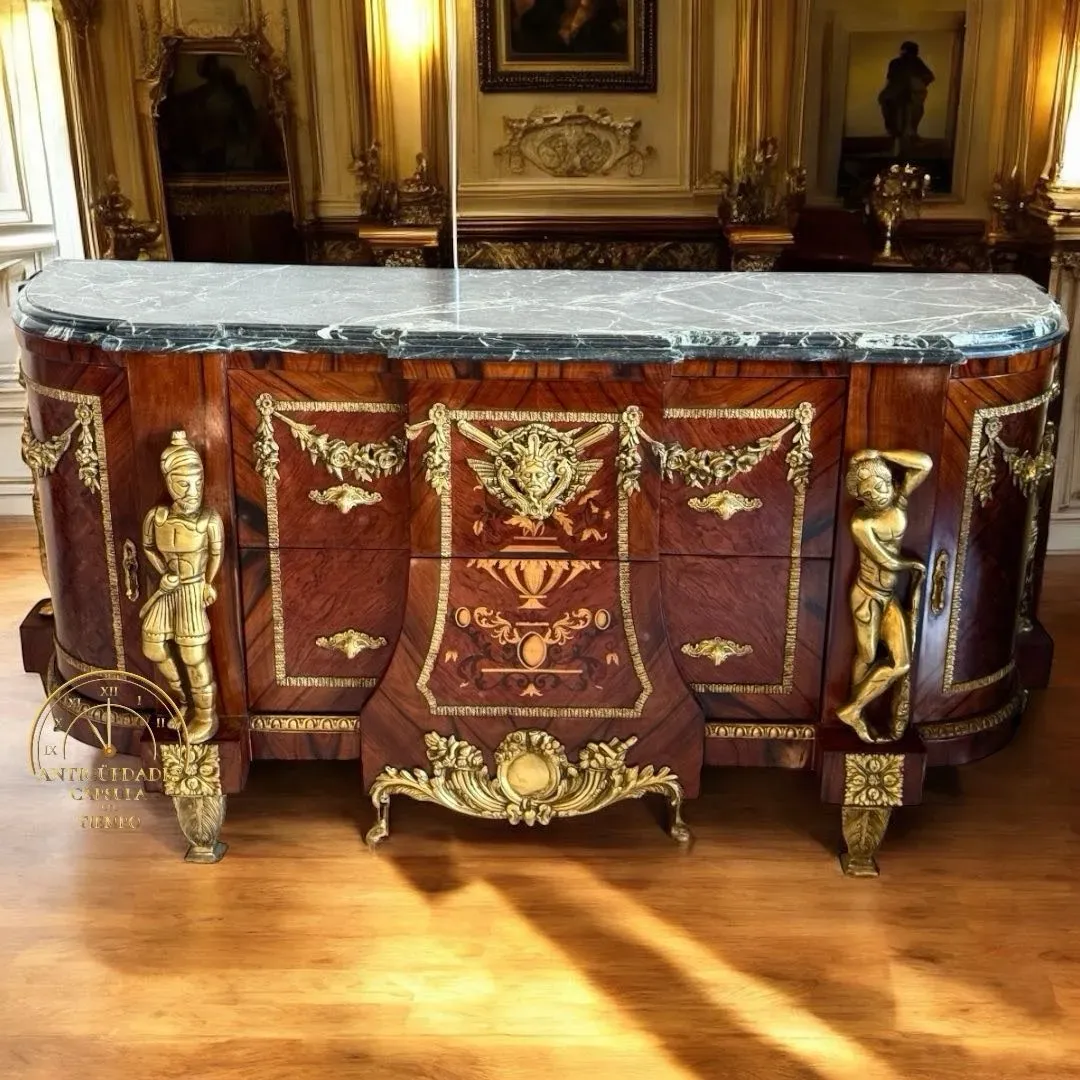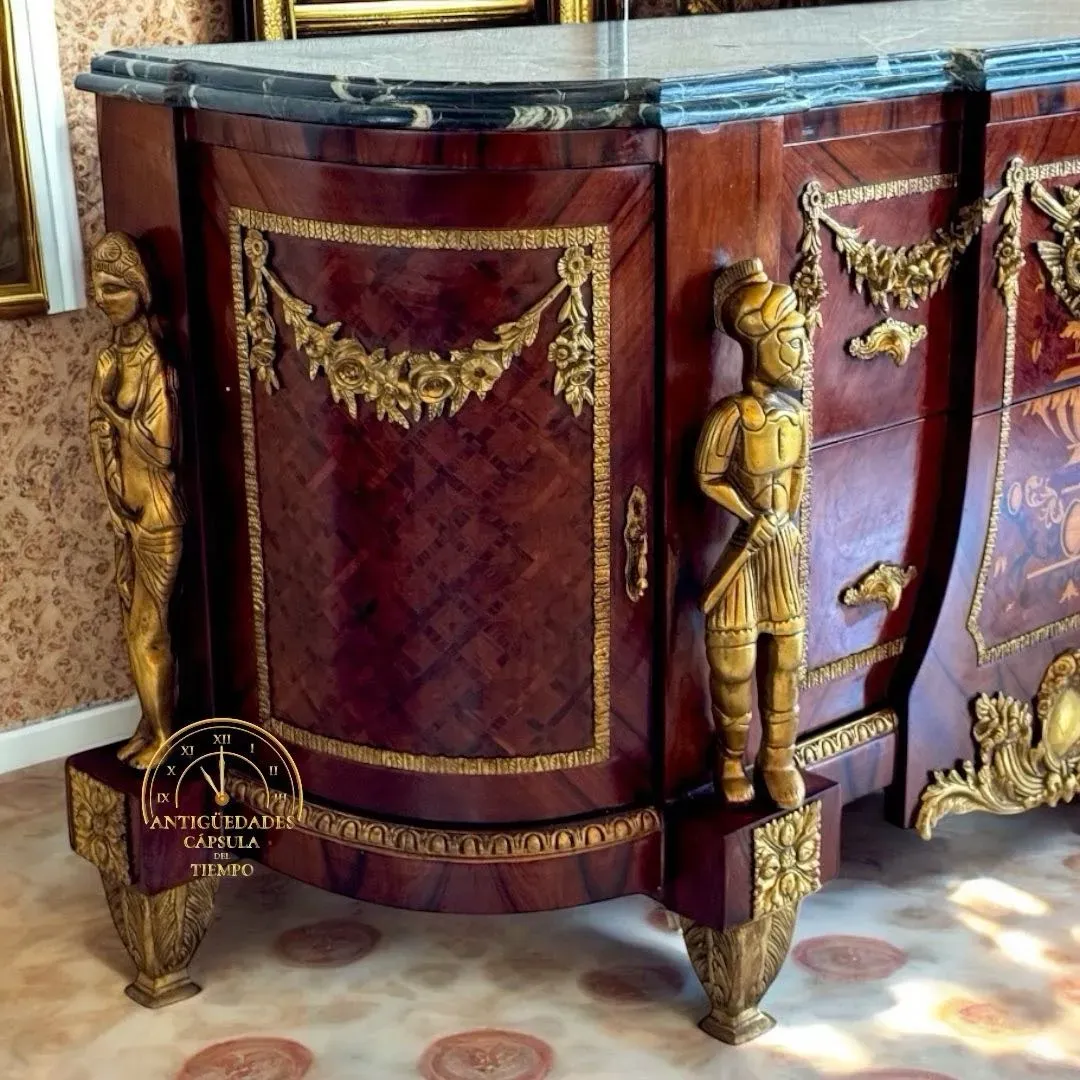 ⚜️GRAN GABINETE ESTILO JEAN RIESENER⚜️ S.XIX⚜️ INSPIRADO EN EBANISTA ALEMÁN ,ESTÁ INCREÍBLE PIEZA ESTÁ ELABORADA POR EXQUISITAS MADERAS, EN FORMA DE “D” EQUIPADO CON CAJONES CENTRALES Y PUERTAS LATERALES⚜️SOBRE EL DESCANZA GRAN PEANA EN MÁRMOL BETADO VERDE⚜️ADORNADO EN SUS LATERALES CON GRANDES ESCU...