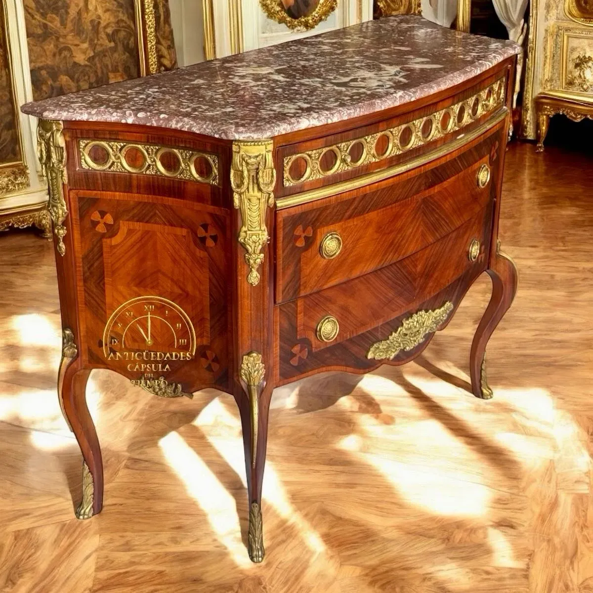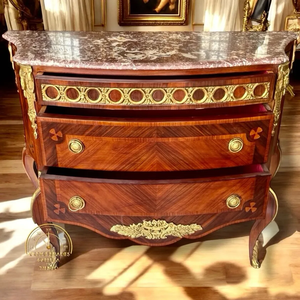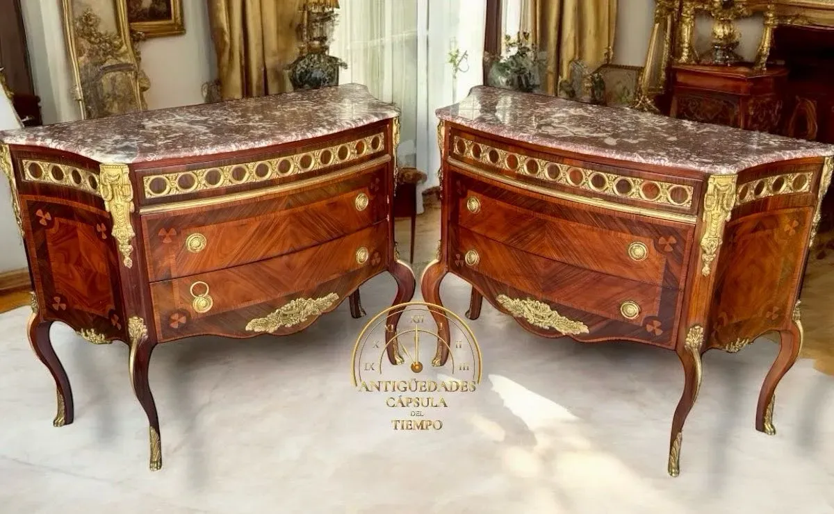 ⚜️PAR DE COMODAS ESTILO KRIEGER MAISON⚜️PIEZAS DE TRANSICIÓN S.XIX⚜️ ELEVADAS SOBRE ELEGANTES PATAS CABRIOLE CON FINOS SABOTS DE ORMULU ENCAJADOS Y ELEGANTE CANALETA QUE CONDUCE A UN DETALLADO SOPORTE FLORAL⚜️EN SU CENTRO DESTACAN 3 CAJONES SIENDO EL CAJÓN INFERIOR EL QUE MUESTRA BELLA MONTURA CENT...