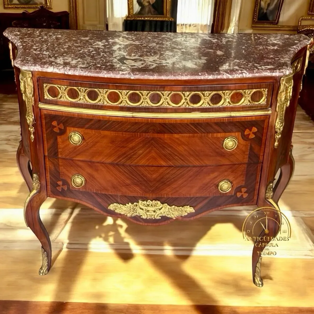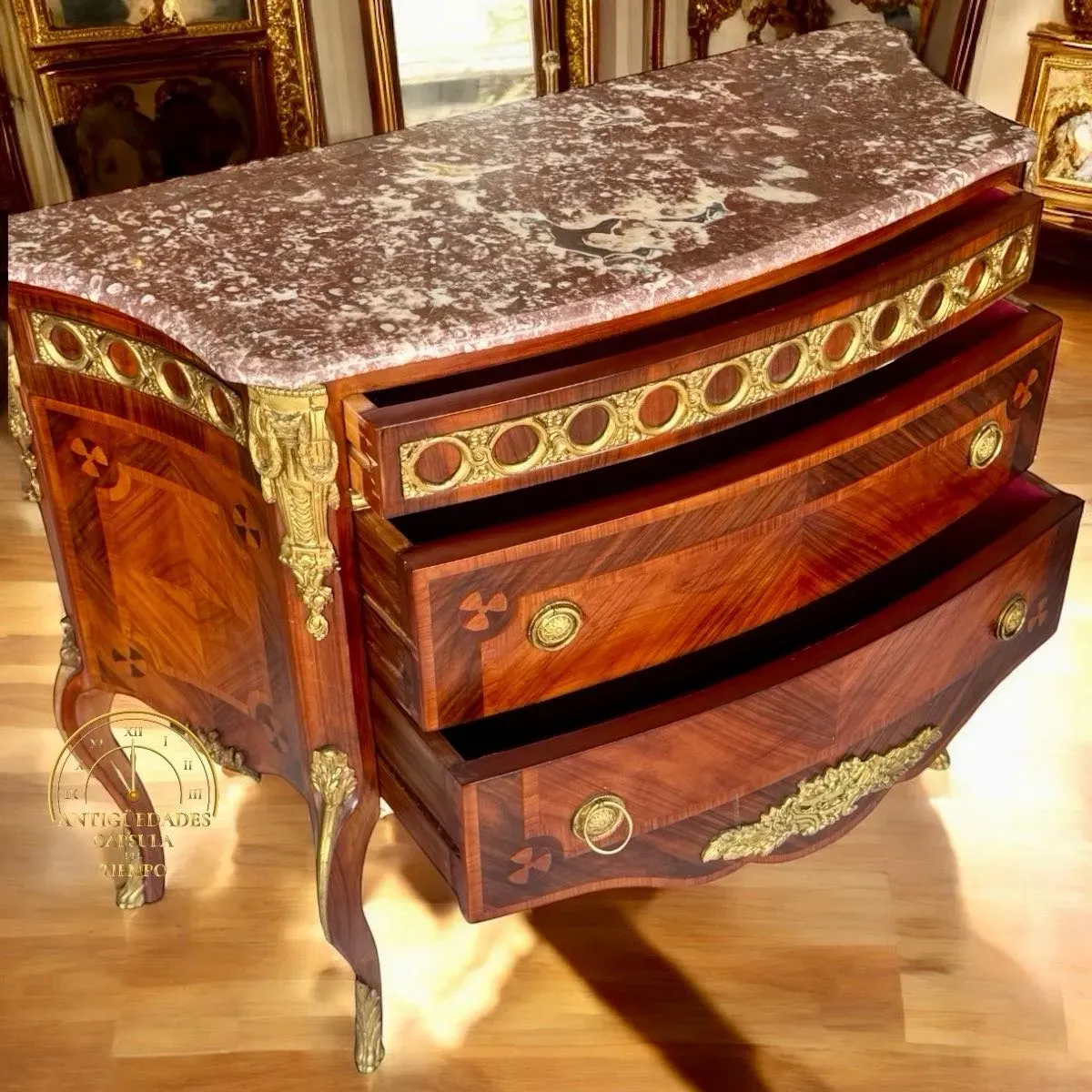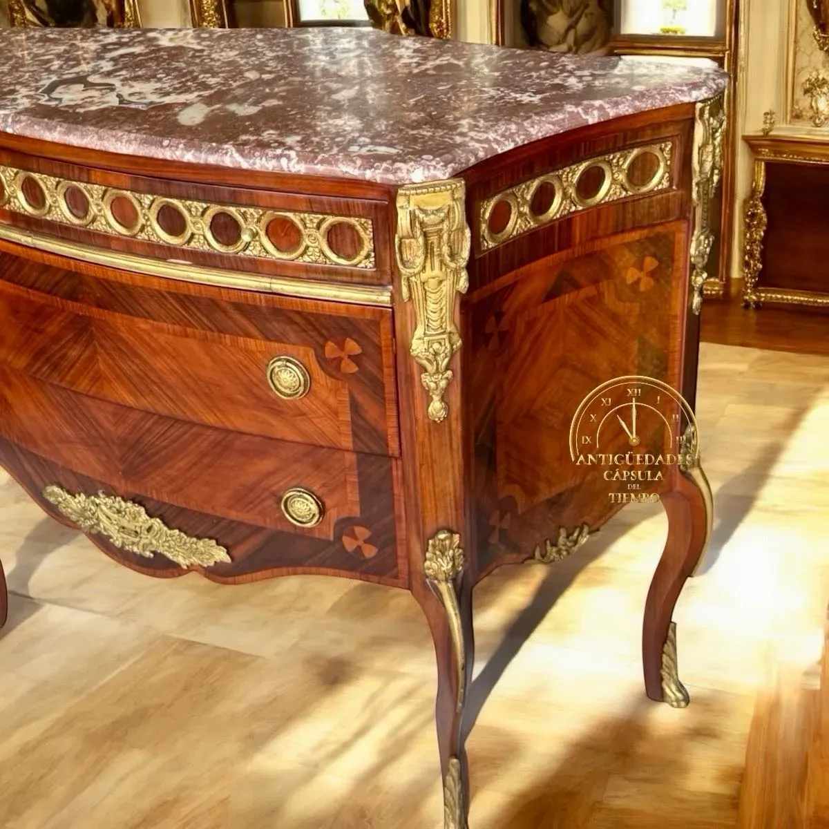 ⚜️PAR DE COMODAS ESTILO KRIEGER MAISON⚜️PIEZAS DE TRANSICIÓN S.XIX⚜️ ELEVADAS SOBRE ELEGANTES PATAS CABRIOLE CON FINOS SABOTS DE ORMULU ENCAJADOS Y ELEGANTE CANALETA QUE CONDUCE A UN DETALLADO SOPORTE FLORAL⚜️EN SU CENTRO DESTACAN 3 CAJONES SIENDO EL CAJÓN INFERIOR EL QUE MUESTRA BELLA MONTURA CENT...