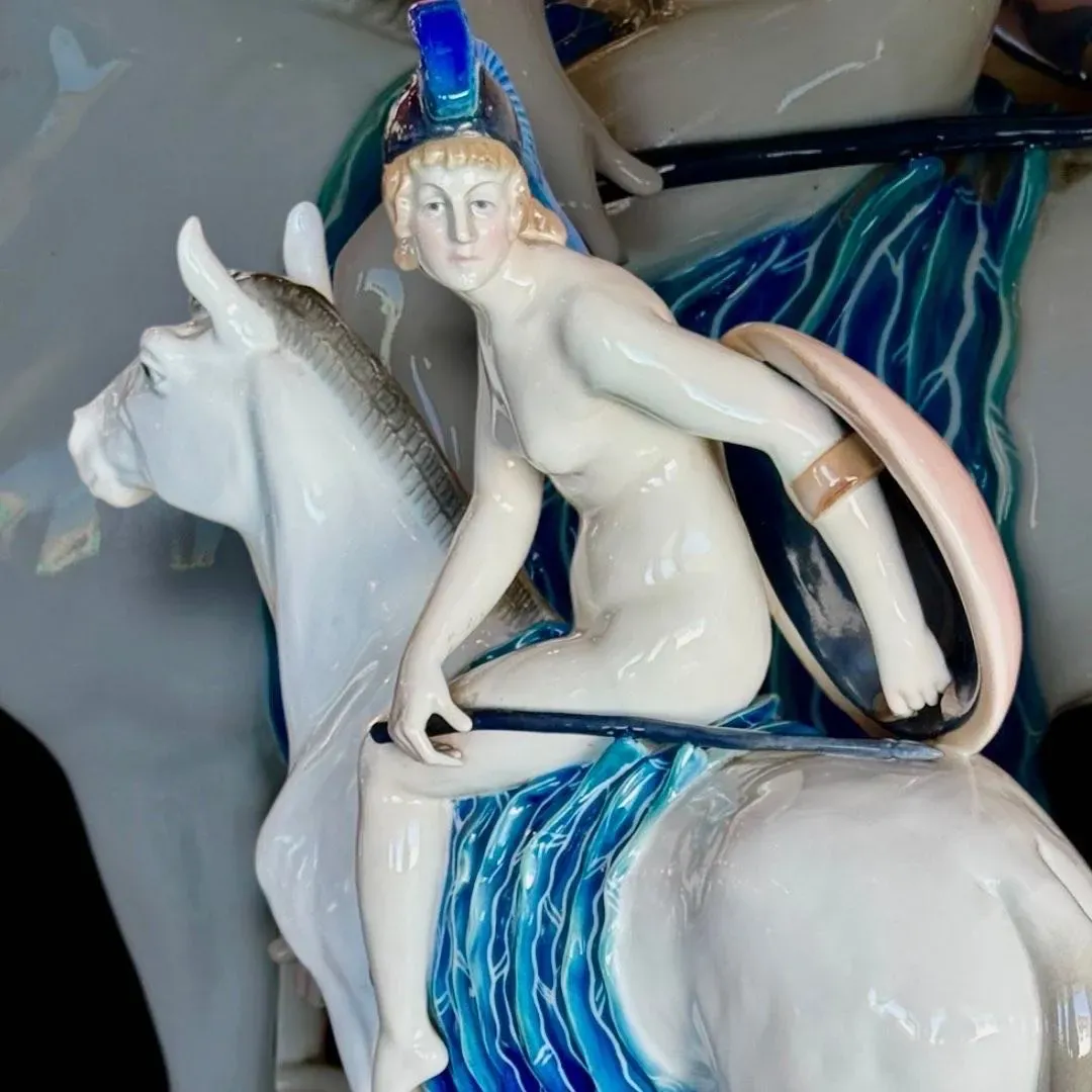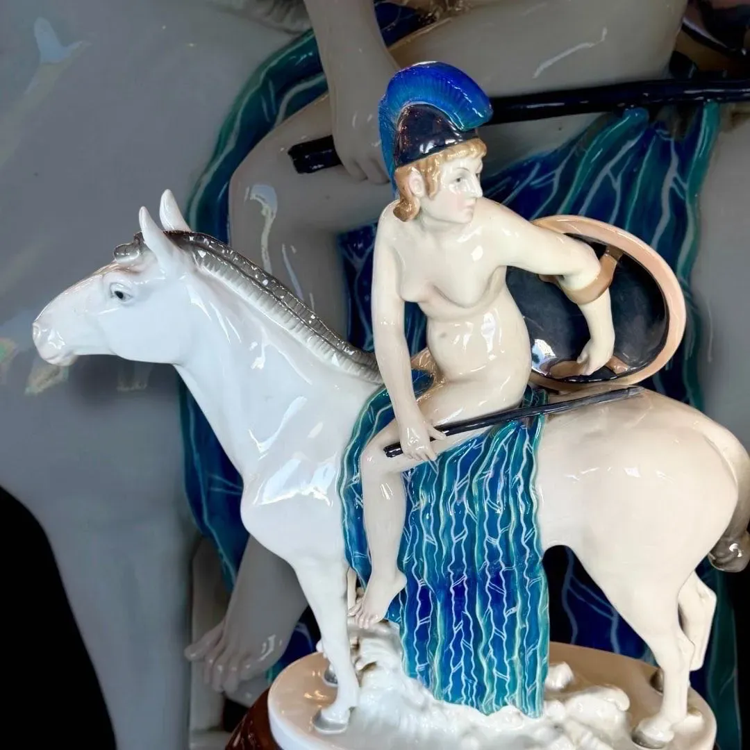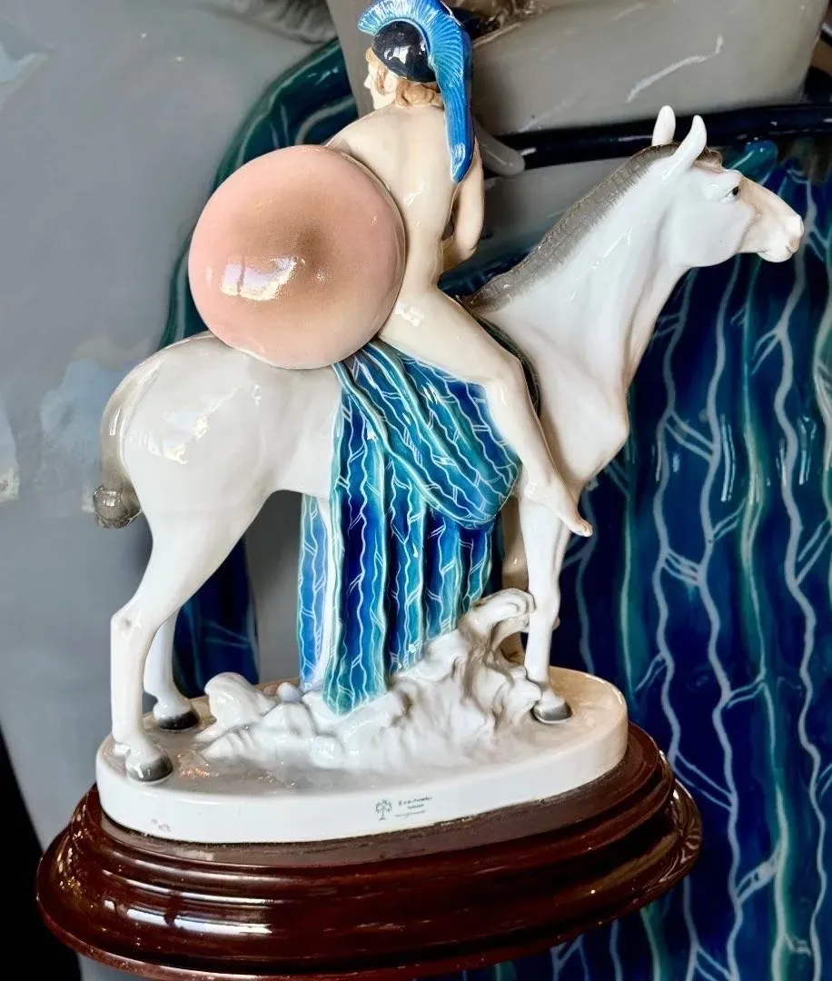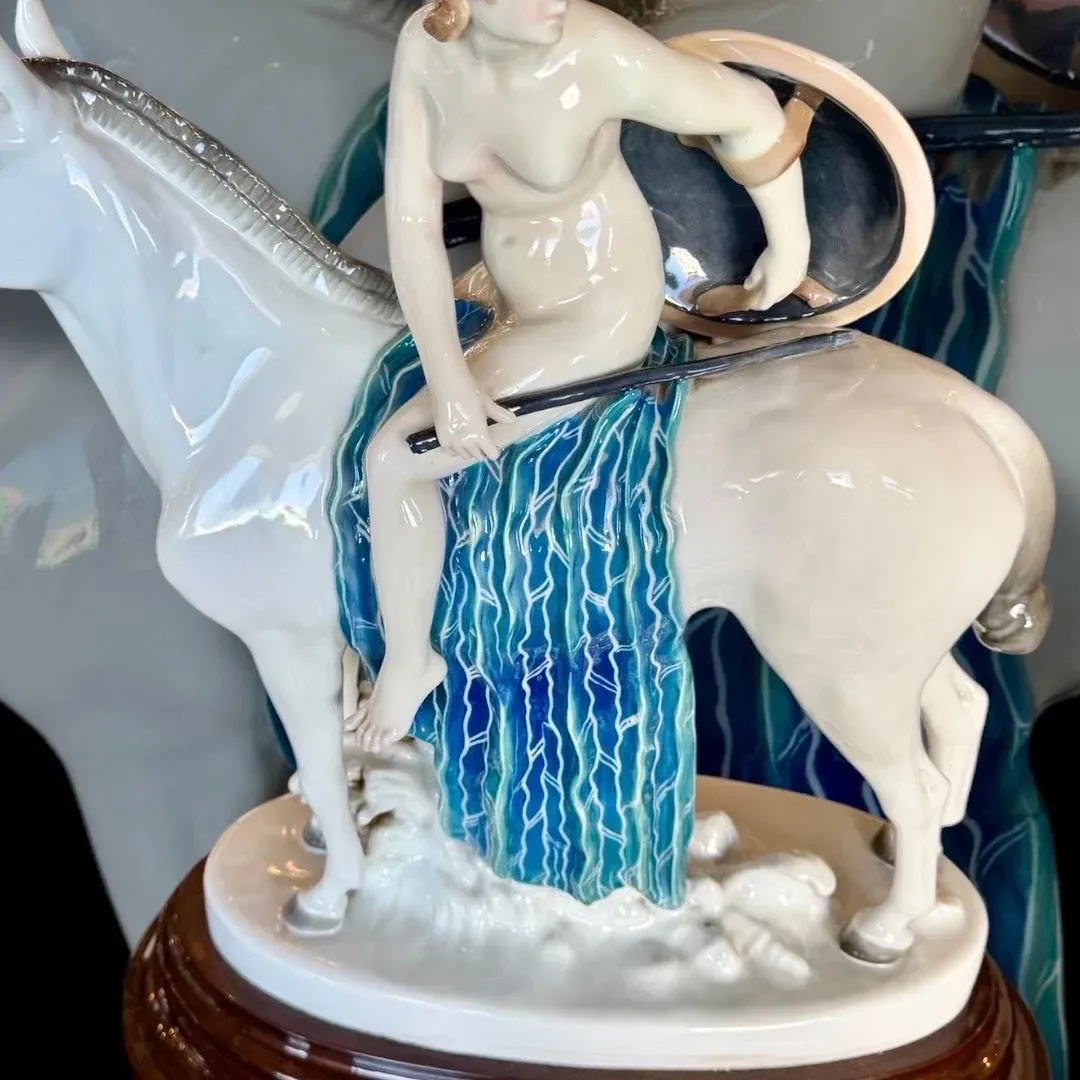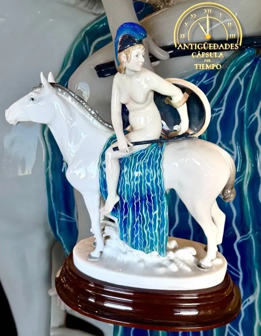⚜️BELLA PIEZA DE COLECCIÓN ⚜️GERMANY⚜️ KARL ENS VOLKSTEDT⚜️ INCREÍBLE ESCENA DE AMAZONA A CABALLO DESNUDA CON MIRADA QUE REVELA CIERTA INSEGURIDAD ⚜️ ELABORADA EN PORCELANA Y DECORADA CON COLORES PASTEL⚜️