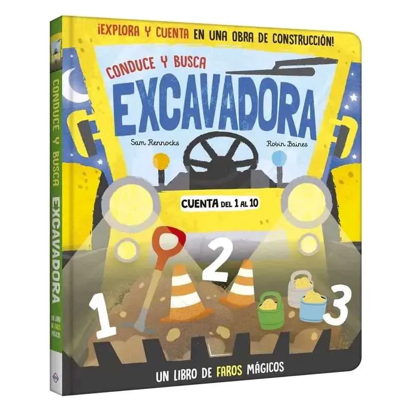 Con un timón fácil de usar en cada página de la derecha, simplemente gira el volante para descubrir imágenes ocultas en los haces de luz de los faros de la excavadora y cuenta del 1 al 10.