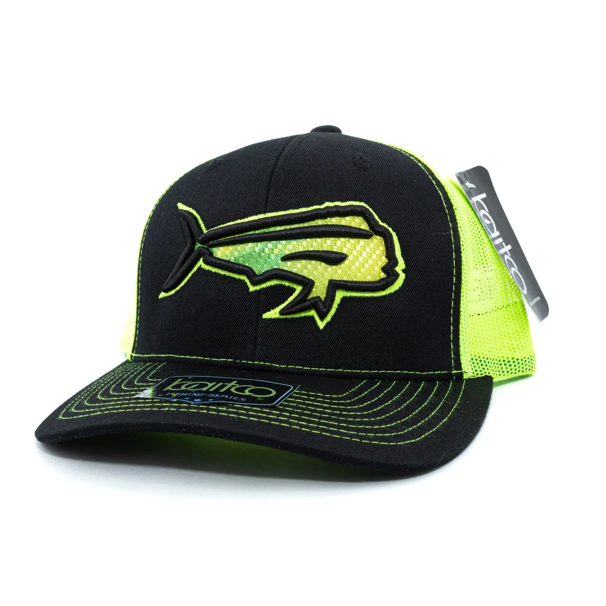 En la parte frontal, de tela sólida en color amarillo brillante, resalta un hermoso pez dorado (Mahi-Mahi) bordado en tonos vibrantes.