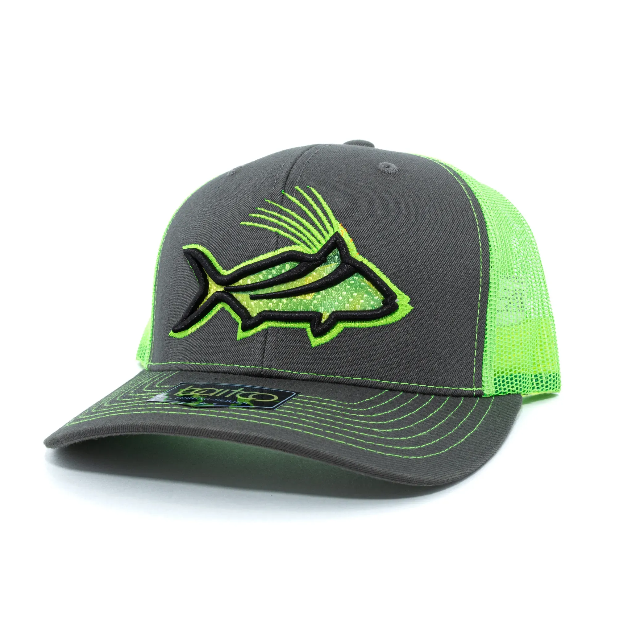 En la parte frontal, de tela sólida en color gris oscuro, destaca un impresionante pez gallo bordado con d...
