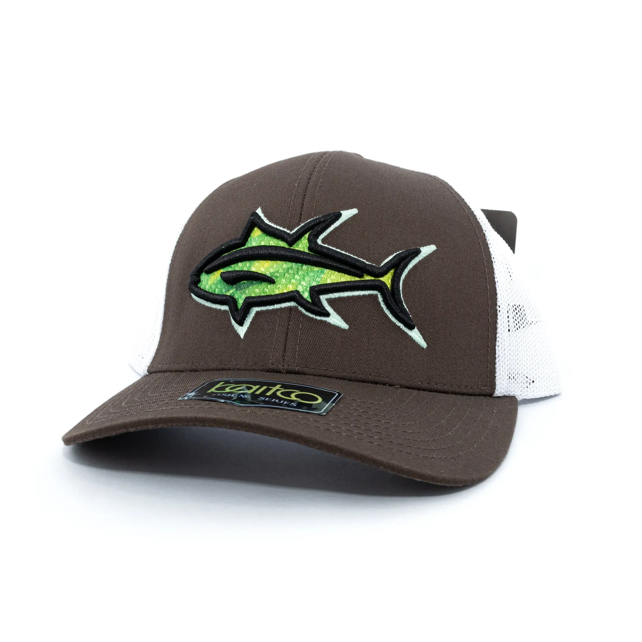 En el centro del frente, está bordado un detallado atún de cuerpo alargado y colores brillantes, con t...