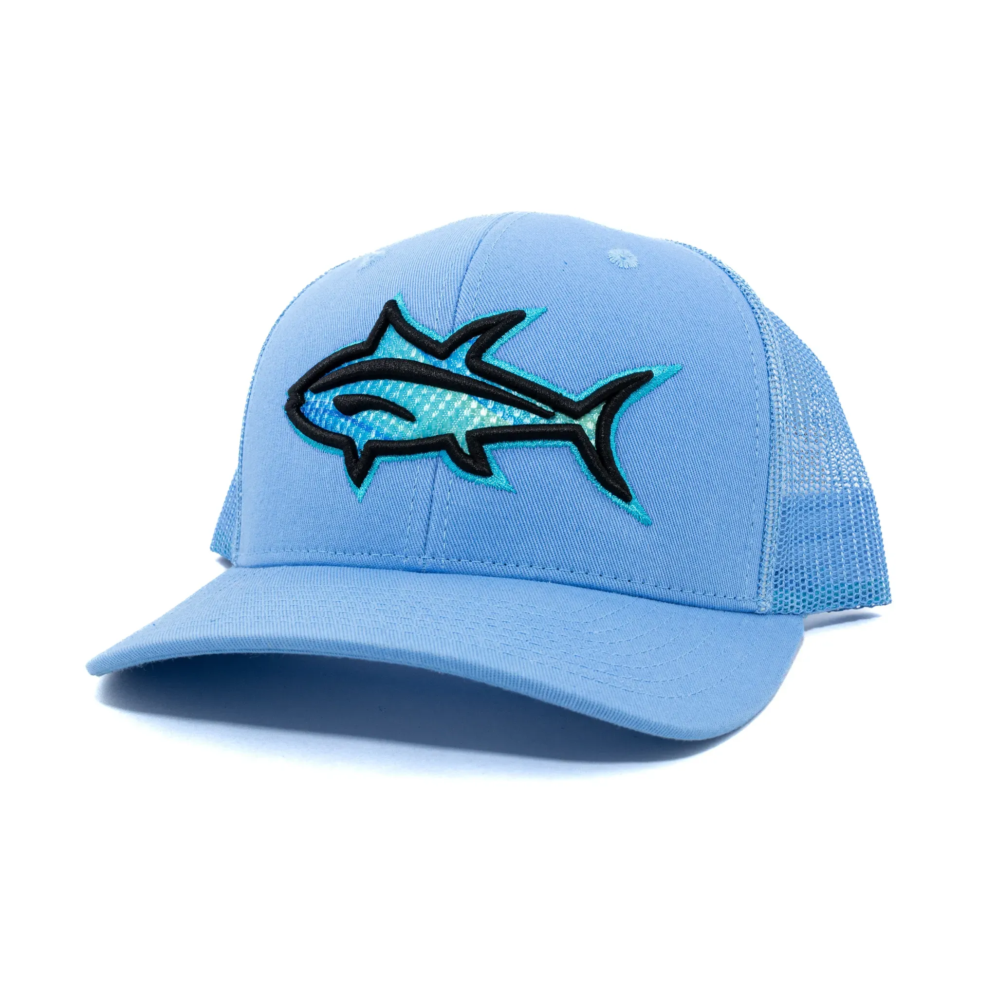 En el centro del frente, está bordado un detallado atún de cuerpo alargado y colores brillantes, con t...