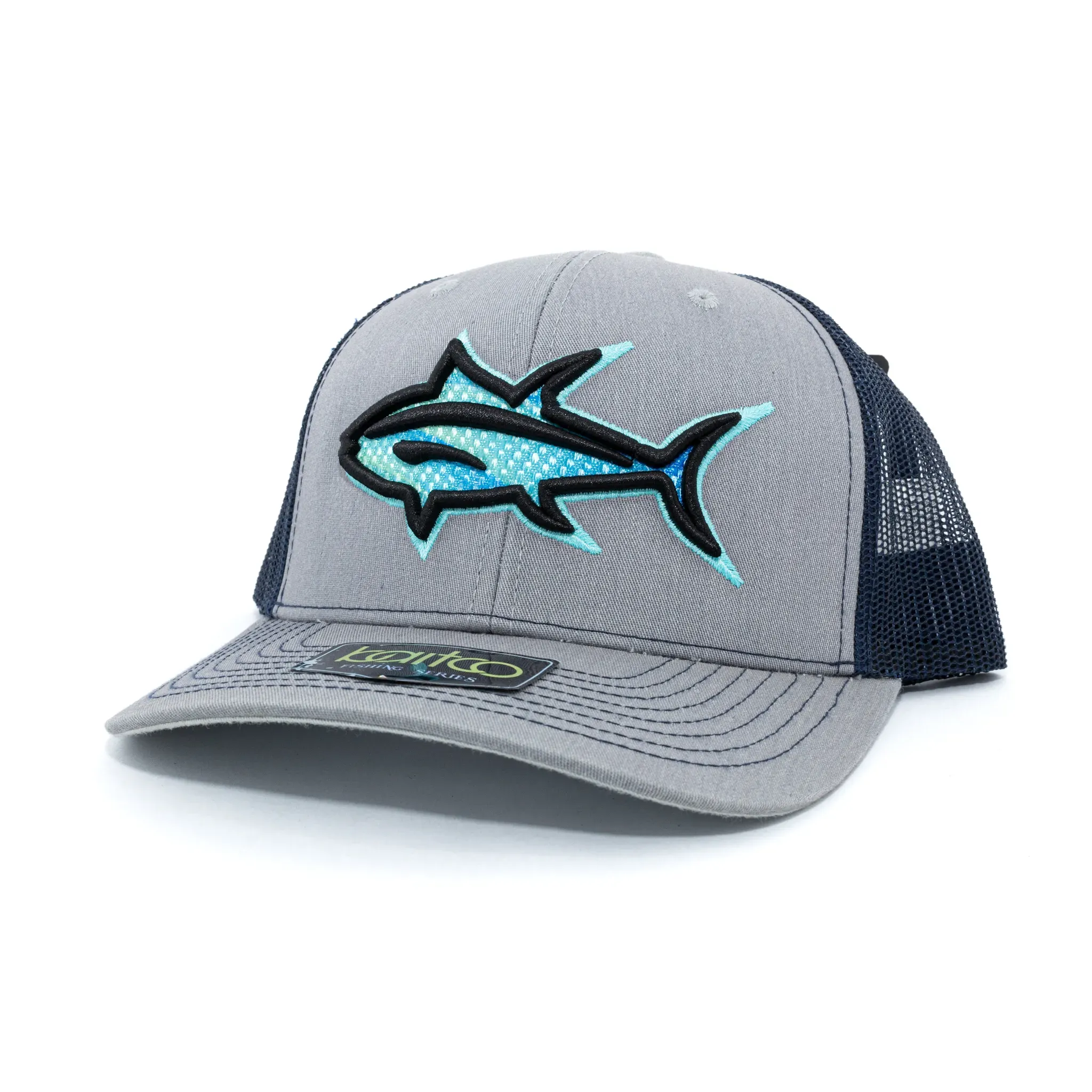 En el centro del frente, está bordado un detallado atún de cuerpo alargado y colores brillantes, con t...
