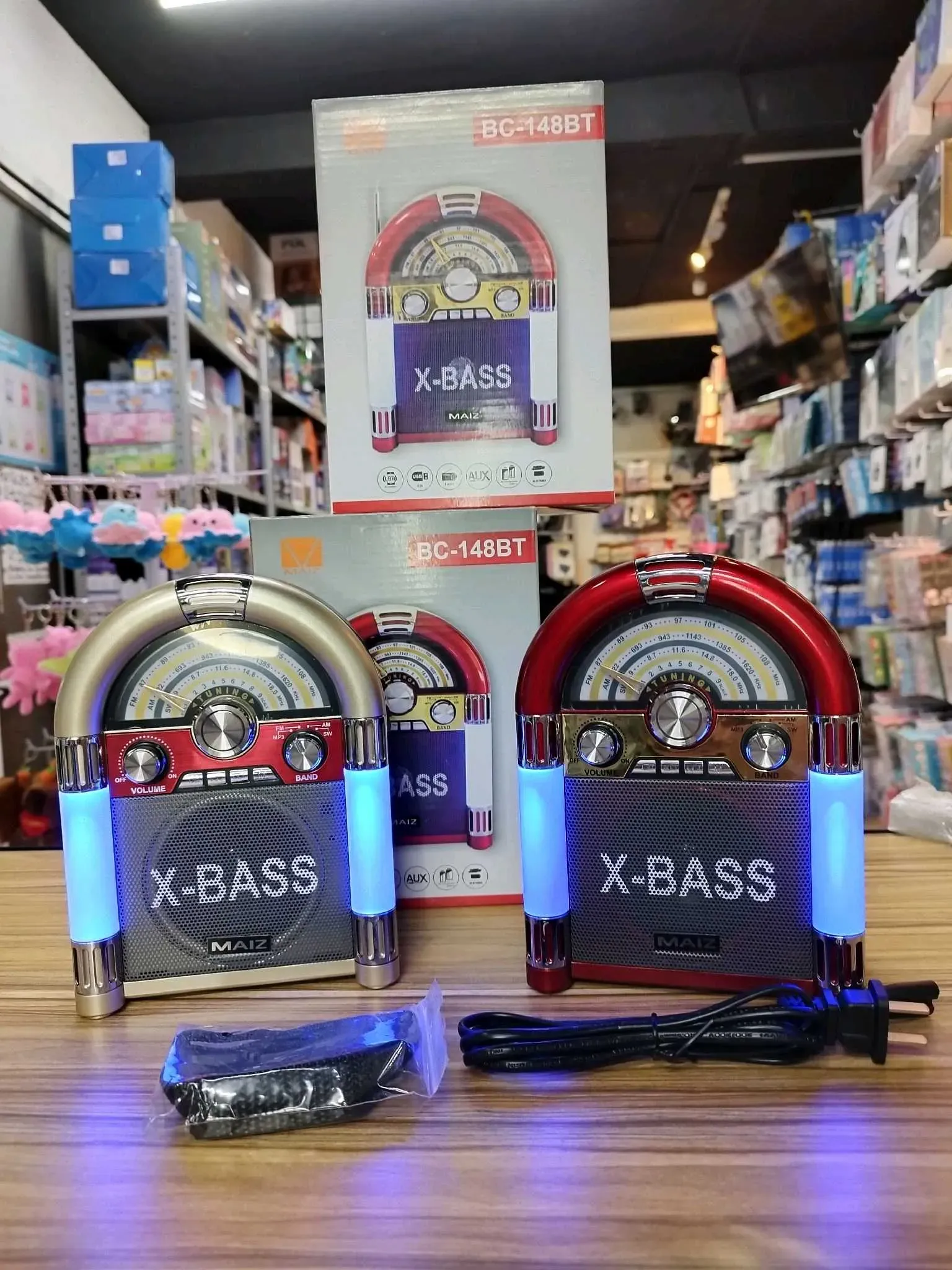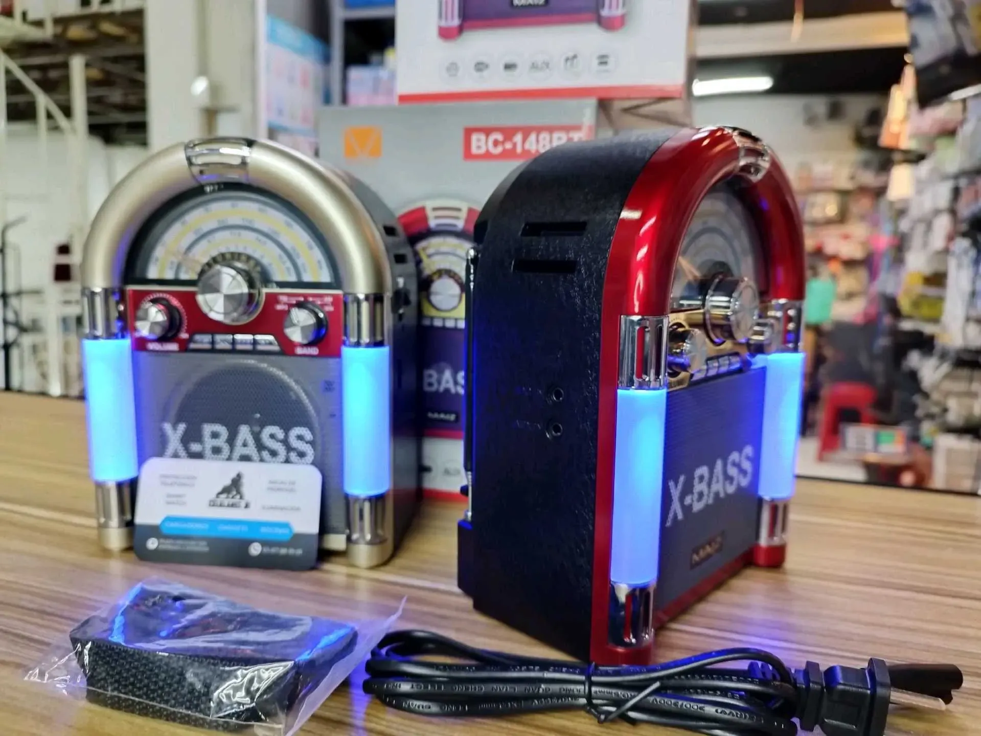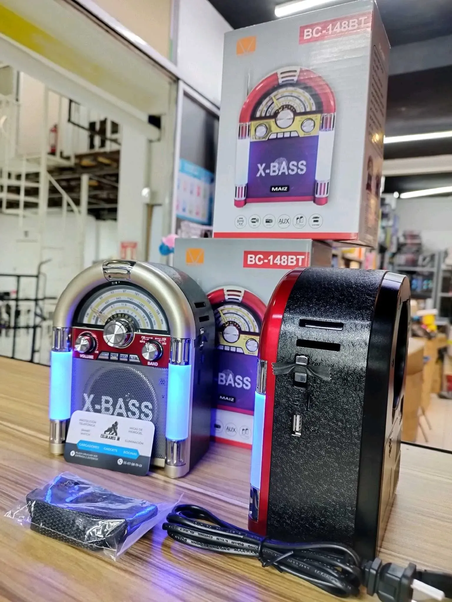 Bocina de colección retro en forma de rockola con iluminación en luz del y gran sonido con sintonizador de radio 3 bandas FM AM SW recargable con batería de larga duración también es Bluetooth y tiene ranura para memoria SD y USB Aux .