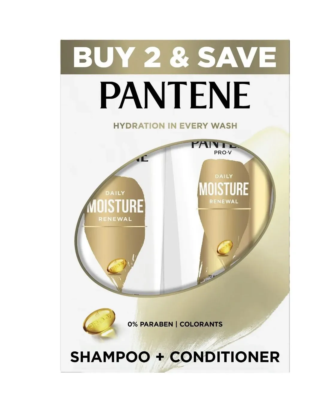 Pantene Daily Moisture shampoo y acondicionador Dual Pack contiene un shampoo (10.4oz) y un acondicionador (9oz) que limpia e hidrata el cabello seco al eliminar la suciedad e impurezas mientras humecta tus mechones para suavidad y manejabilidad. Estos productos de shampoo y acondicionador hidratant...