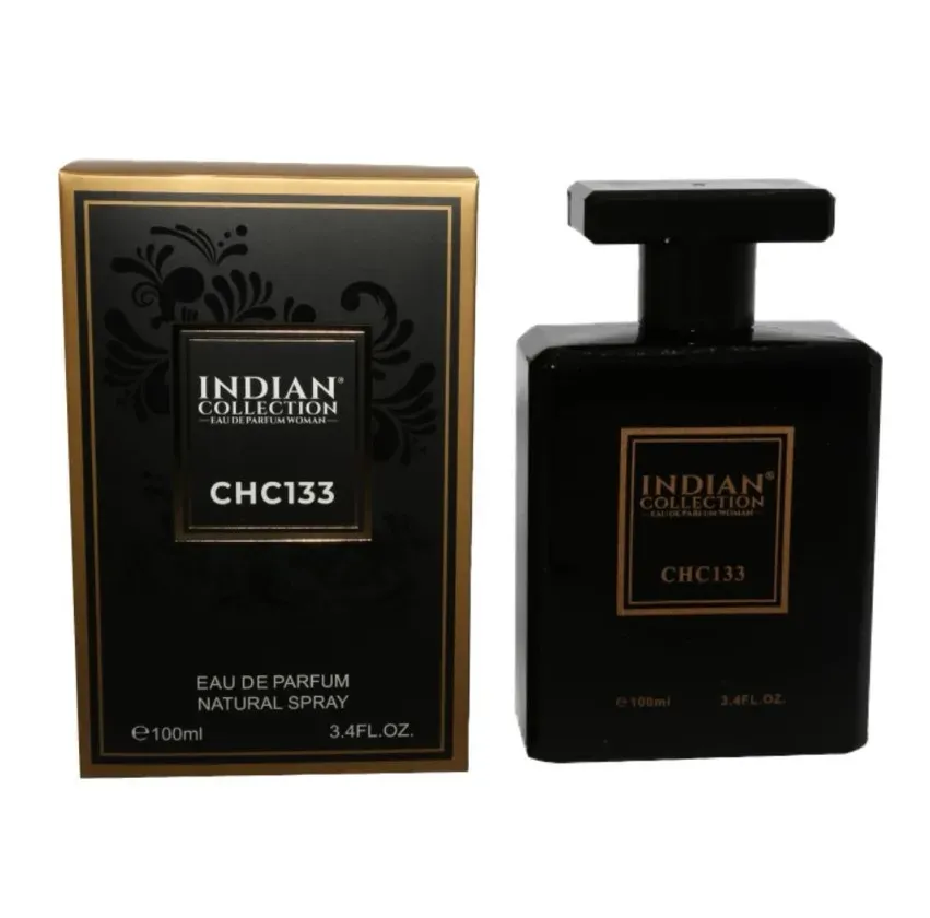 Una botella de la colección india CHC133 junto a su caja. Disfruta de la exquisita fragancia de esta colección única que te transportará a la India con cada aplicación. Perfecto para regalar o para consentirte a ti mismo. ¡Hazte con este tesoro aromático hoy mismo!