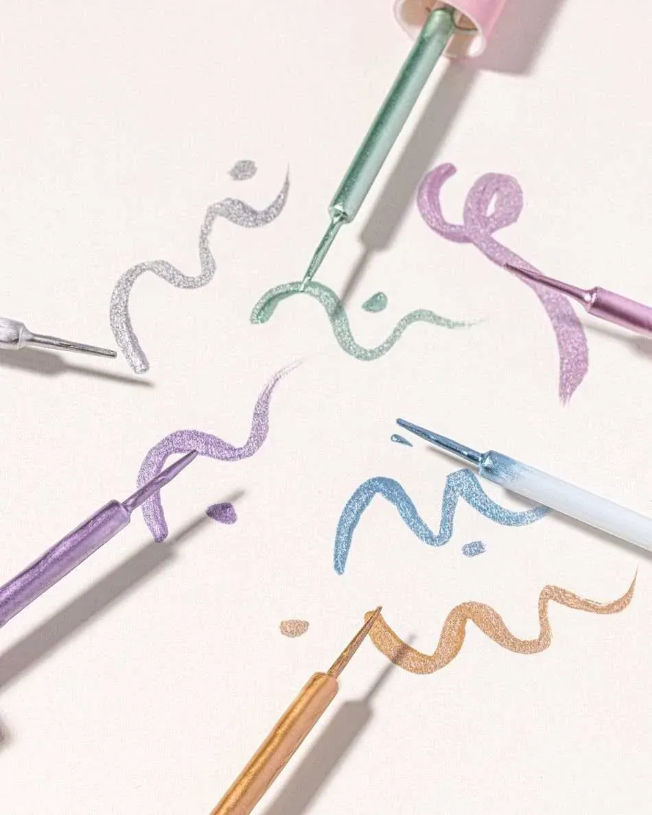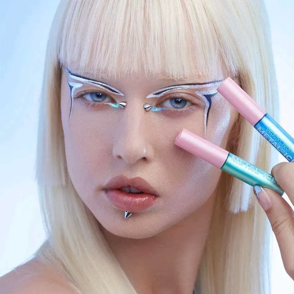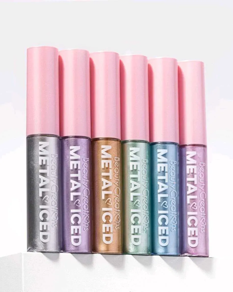 Nuestros delineadores metálicos Metal-Iced vienen en 6 divertidos colores metálicos suaves con propiedades reflectantes que capturan la luz de manera hermosa.