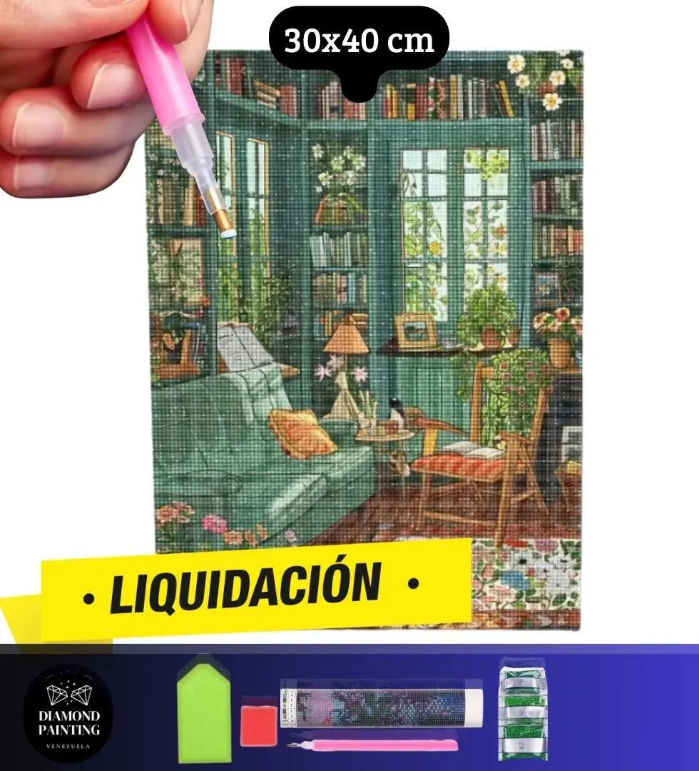 ⭐OFERTA Casa de Campo Biblioteca Estilo Acuarela 30x40cm - Kit Diamond Painting Estandar - Diamantes Redondos en Acrilico - Precio Euro BCV