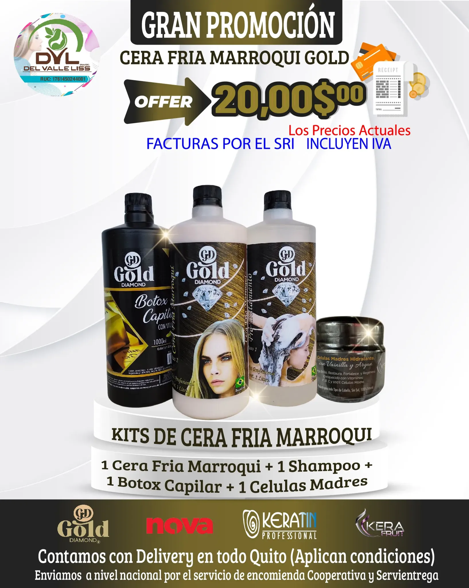Cera Fría Marroquí Gold Diamond con este kit completo. Obtén un cabello suave, brillante y lleno de vida. Fácil de usar y con resultados duraderos Trabajando en cabellos fuertes, Rebeldes y hasta afroz.