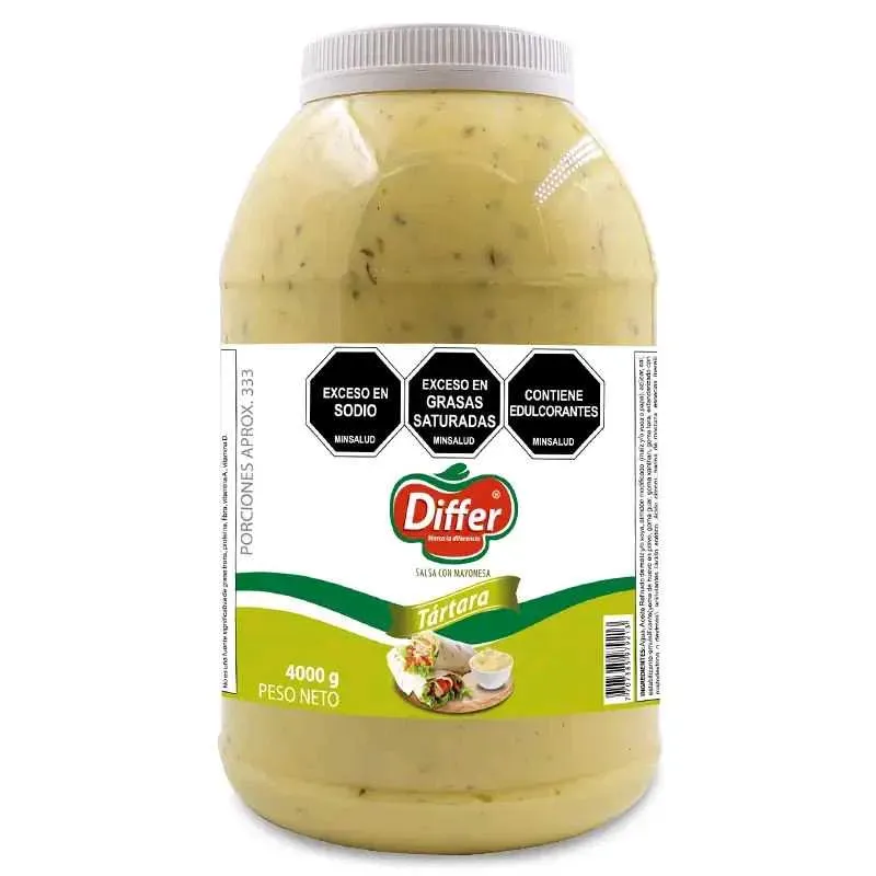 Disfruta del delicioso sabor de la Salsa Tártara Differ en su presentación Frasco de 4000 gramos. Ideal para acompañar tus platos favoritos y darles un toque especial. El aliado perfecto para realzar el sabor de tus comidas. ¡No puede faltar en tu cocina!