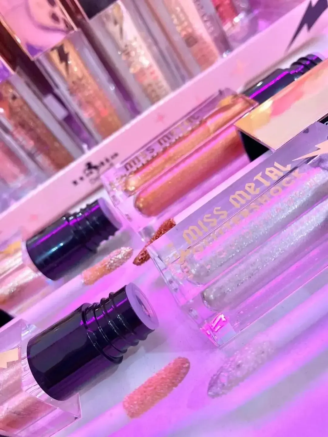 Las sombras de ojos líquidas Miss Metal Glittershock te sorprenderán con su deslumbrante mezcla de purpurina y pigmentos perlados. Cada tono está inmensamente pigmentado, diseñado para mantener el brillo y durar todo el día sin secarse. ¡Mejora tu look y prepárate para brillar!
