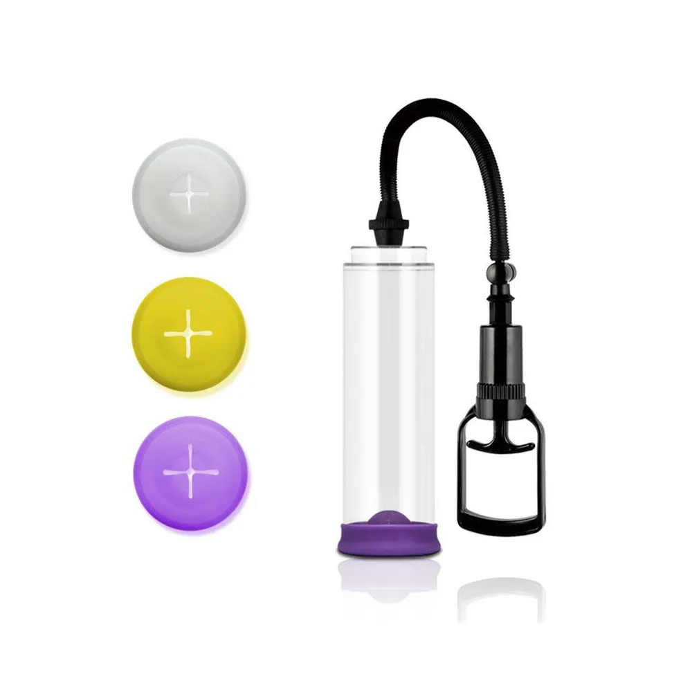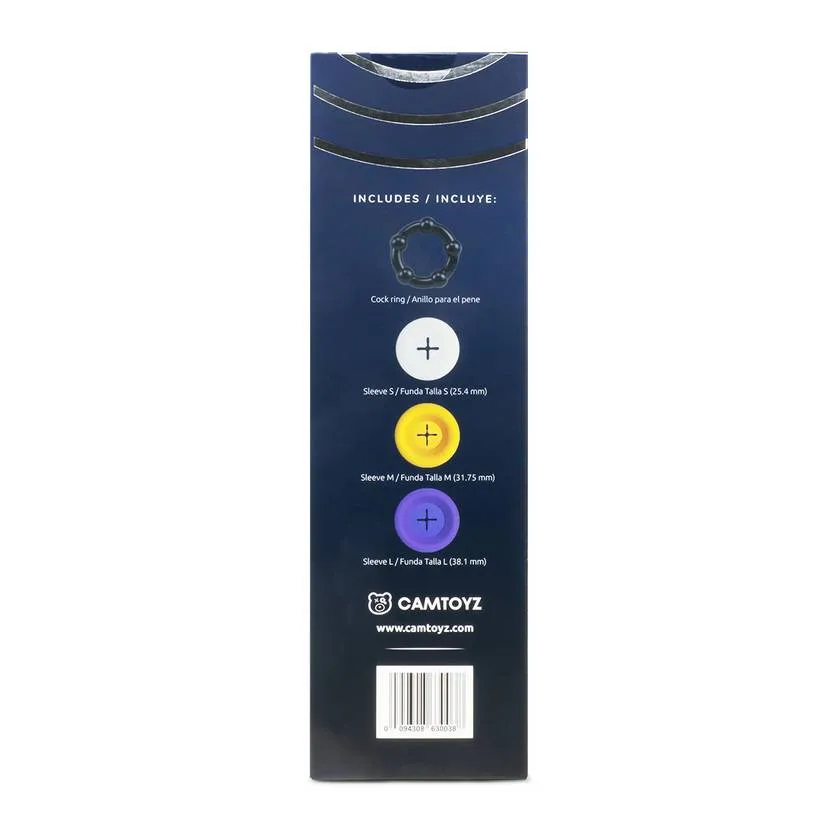 Medidas • Longitud 23,5 cm • Diámetro interno: 6,5 cm • Diámetro boquilla blanca: 2,5 cm • Diámetro boquilla amarilla: 3,1 cm • Diámetro boquilla morada: 3,8 cm Contenido Incluye 3 fundas en 3 tamaños diferentes S (Blanca), M (Amarilla) y L (Morada). Además, un anillo expandible para el pene.