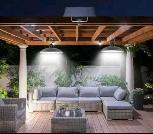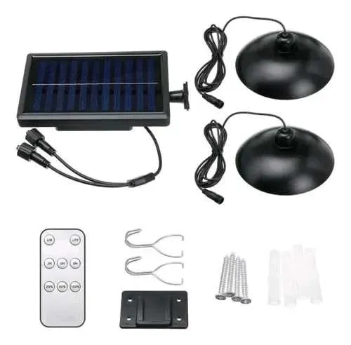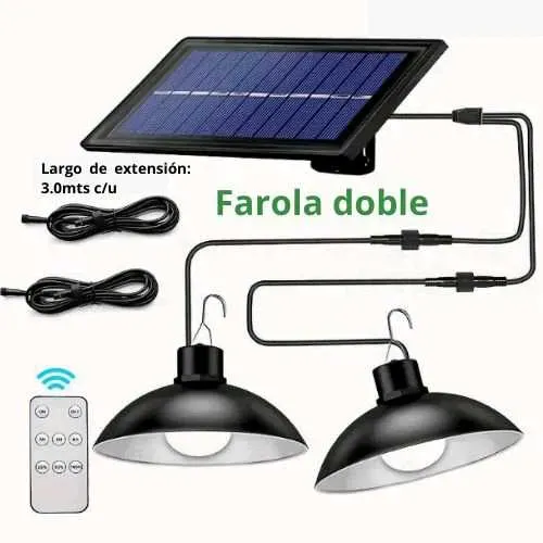 📍Lámpara solar colgante con control remoto, recargable interior/exterior 2 bombillos LED, ideal para depósitos, jardines, patio, garaje, entre otros. Panel solar eficiente y bombillos LED.
