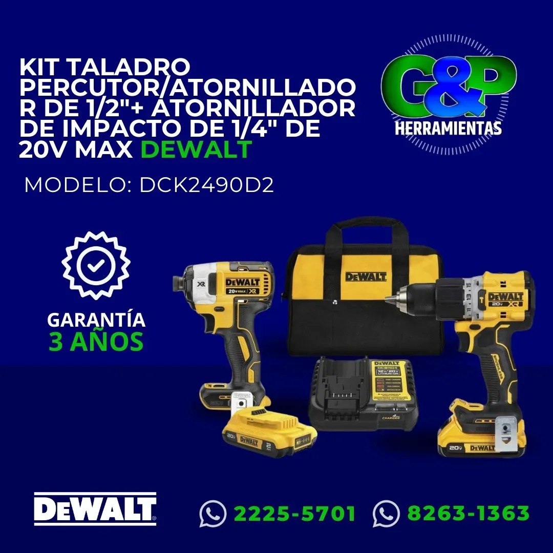 Incluye: Taladro Percutor 1/2" 20V + Atornillador de Impacto 1/4" 20V + 2 baterías + Cargador + bolso